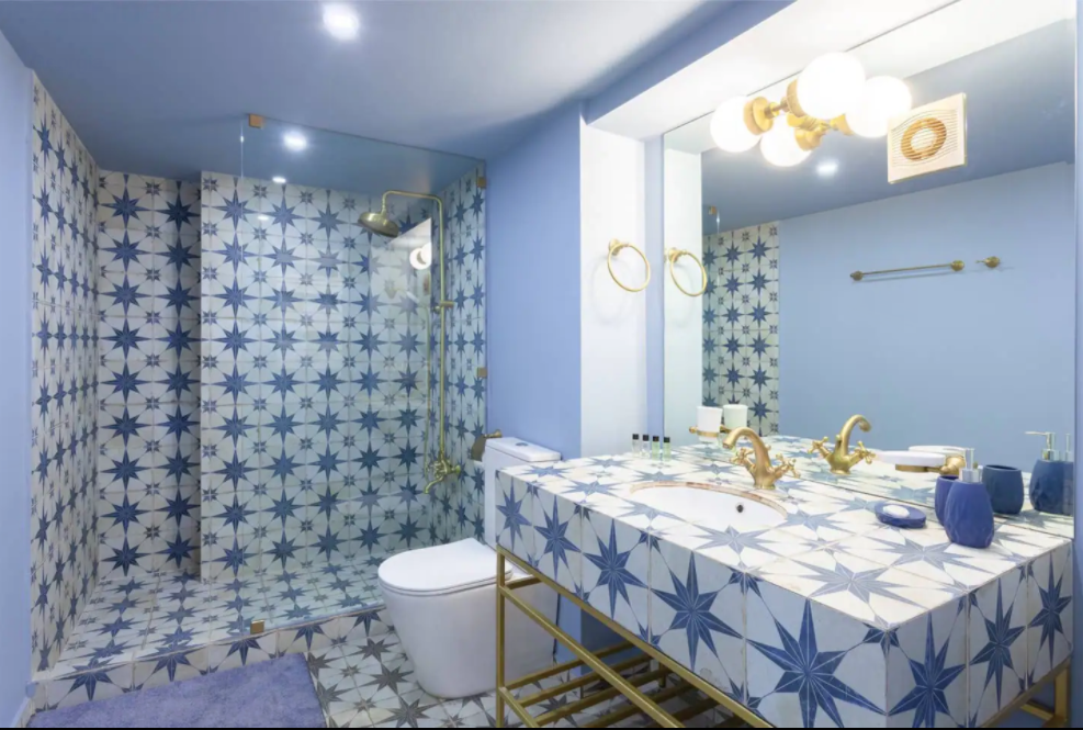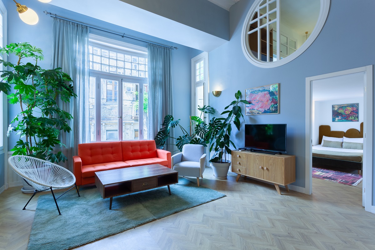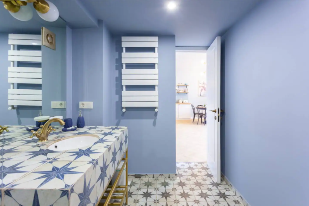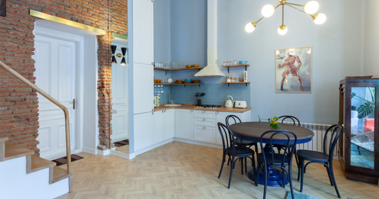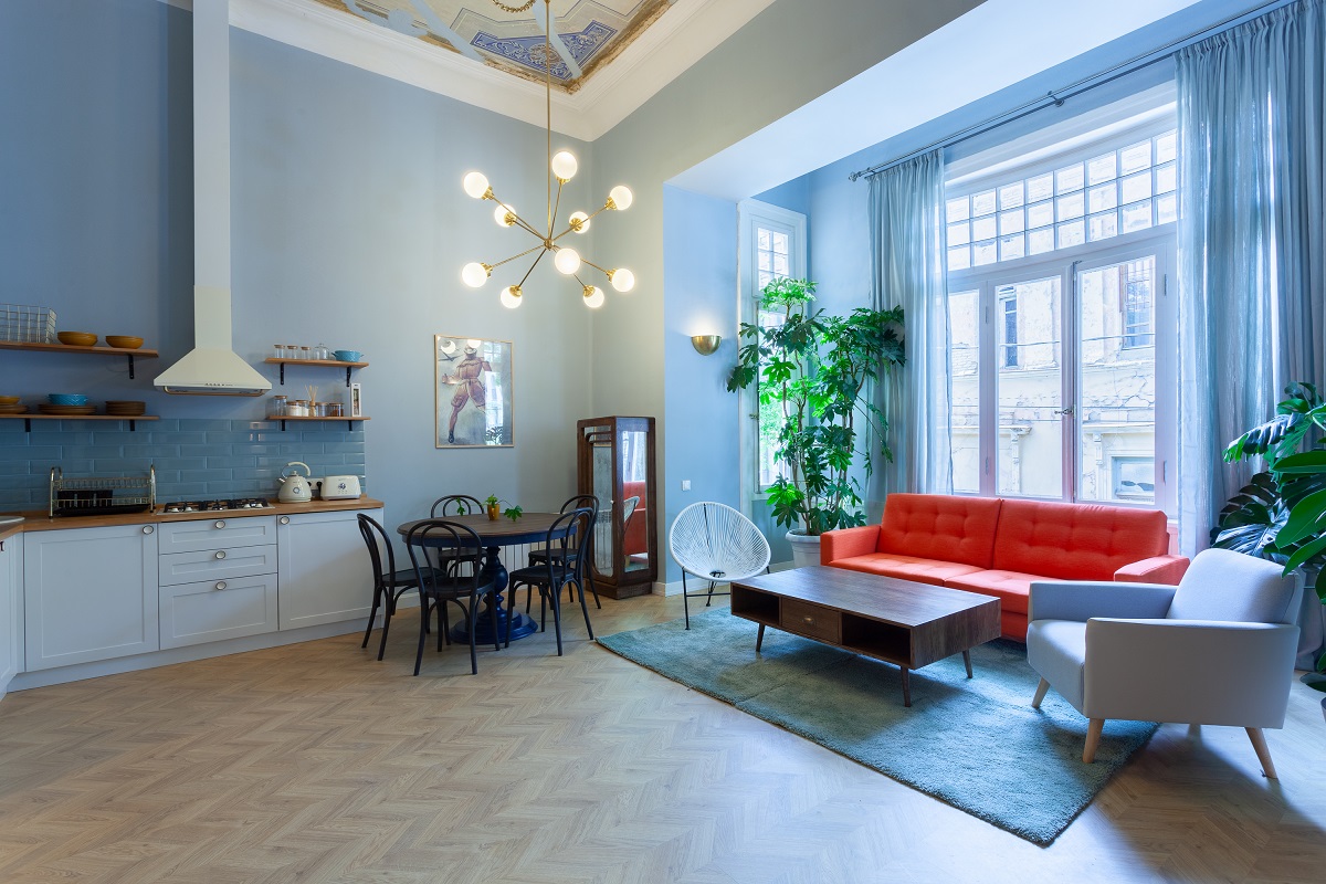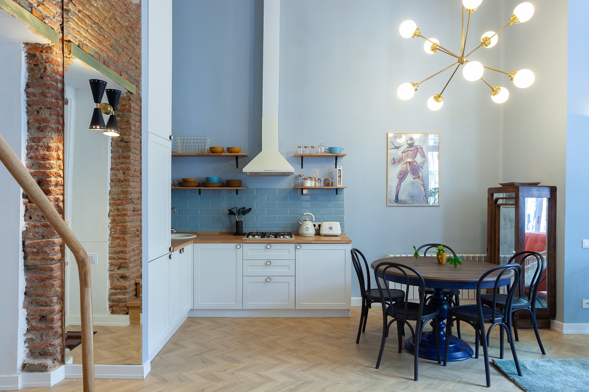 როგორც პროექტის ავტორი, დოდოშკა ჩხეიძე ამბობს, თავდაპირველად იგეგმებოდა კედლების სრულად თეთრ ფერში გადაწყვეტა. თუმცა, მოგვიანებით, დემონტაჟის პროცესში სამუშაო ჯგუფმა აღმოაჩინა ულამაზესად მოხატული ჭერი, რომელმაც დიზაინერს ზუსტად უკარნახა თუ რა ფერები უნდა ყოფილიყო გამოყენებული ინტერიერში. სწორედ ასე იქცა ლურჯის ღია ტონი აღნიშნული ბინის დომინანტ ფერად.