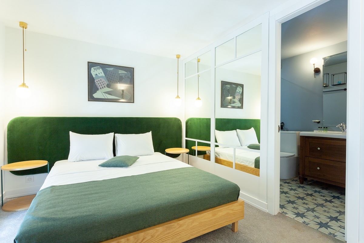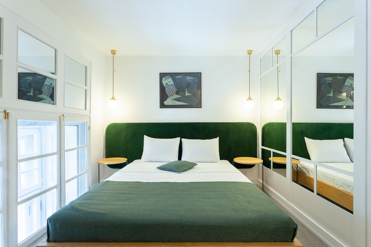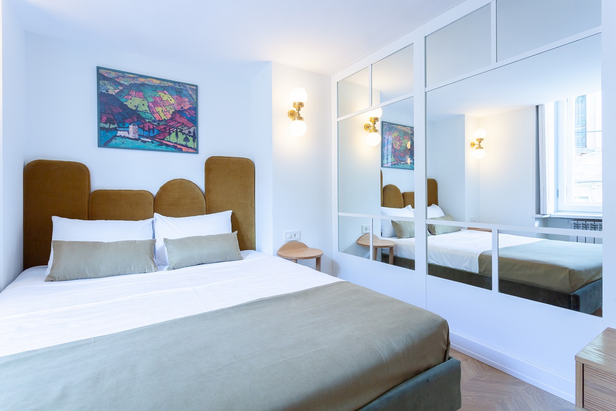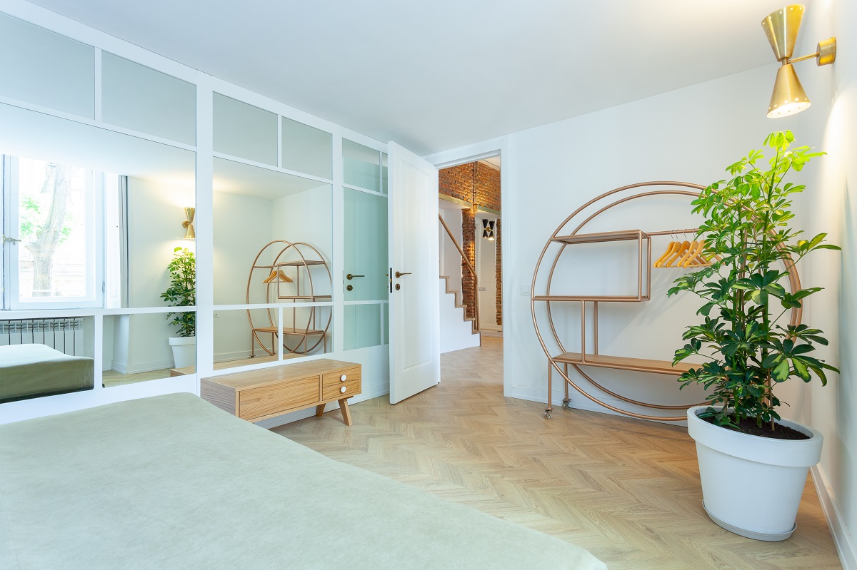 ბინაში უხვად არის გამოყენებული სარკეები, რაც დიზაინერის აზრით, საჭირო გადაწყვეტილება იყო, რადგან სარკე კარგ ვიზუალურ ეფექტს იძლევა, ადიდებს სივრცეს და აორმაგებს განათებას. კონკრეტულ მოცემულობაში ეს ეფექტი საჭირო იყო, ვინაიდან ორივე საძინებელი და სველი წერტილი დაბალჭერიანი და პატარა ზომის გამოვიდა.