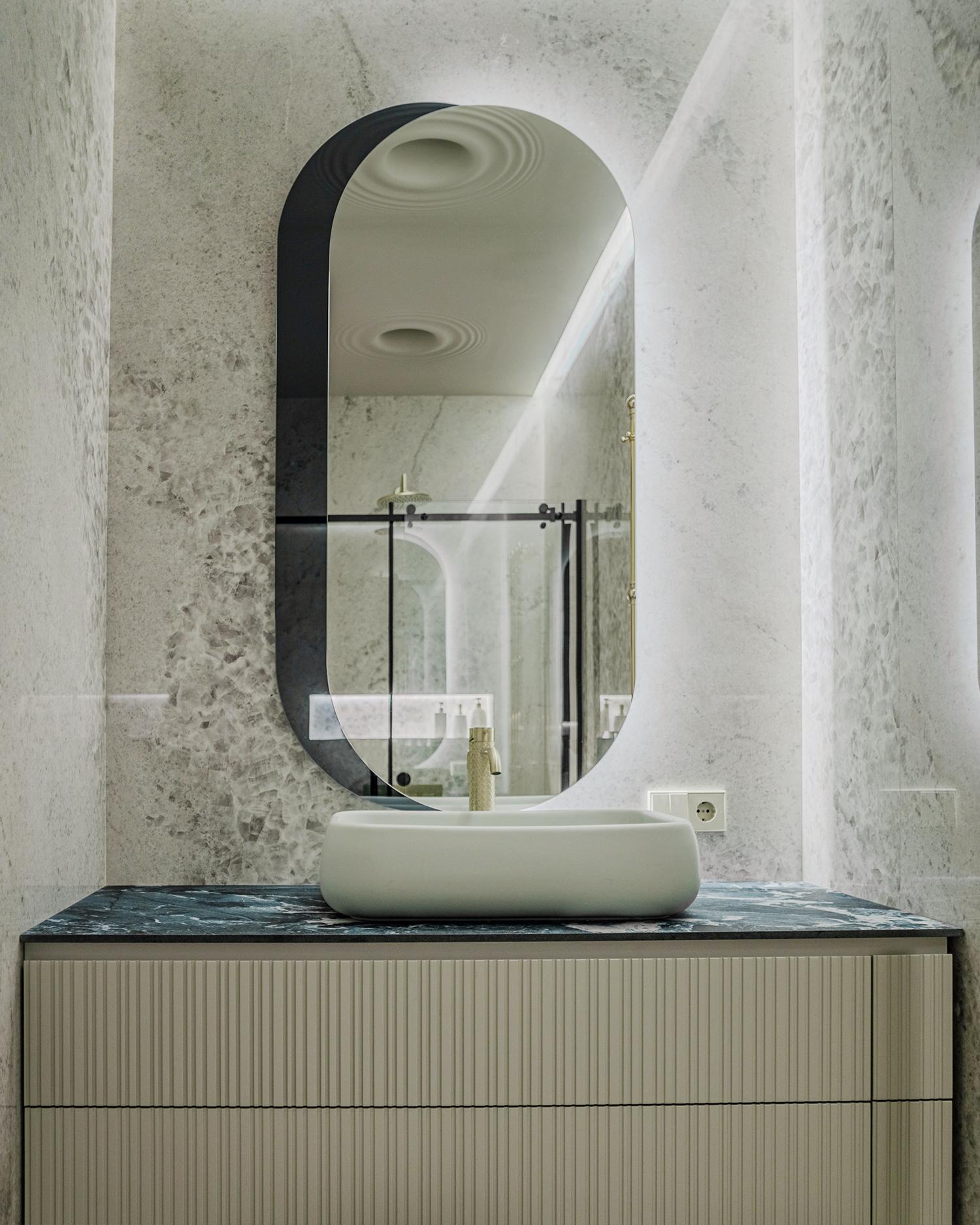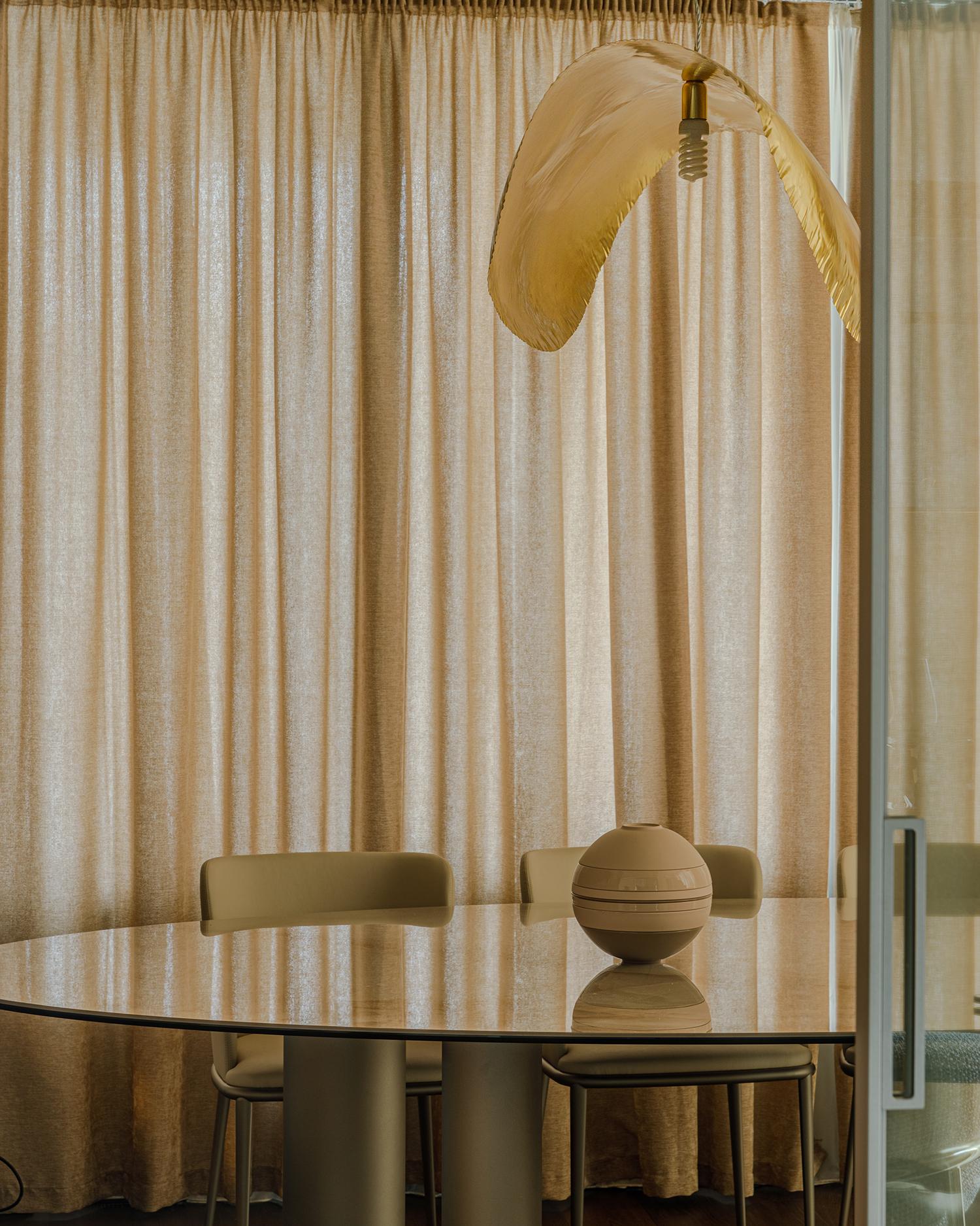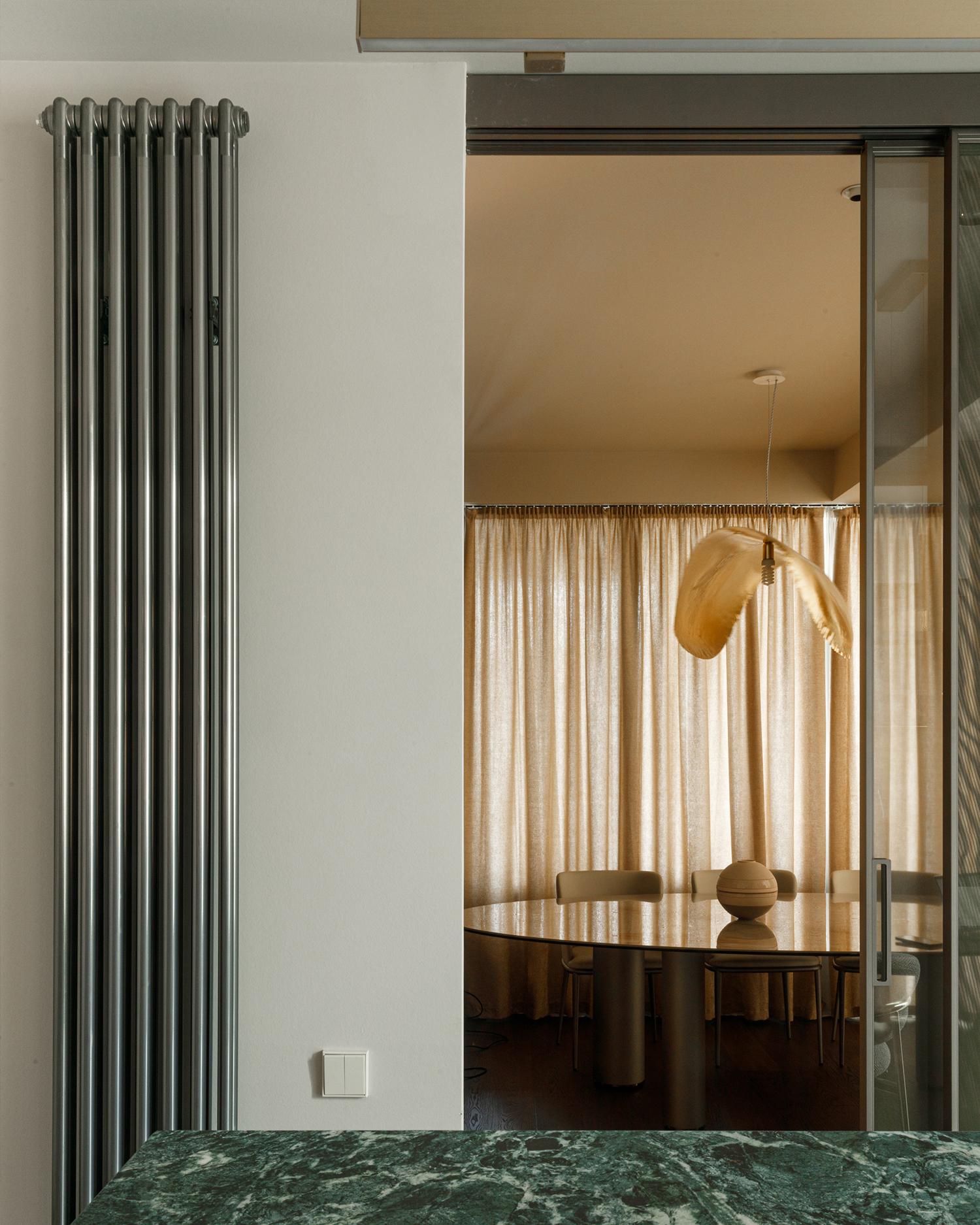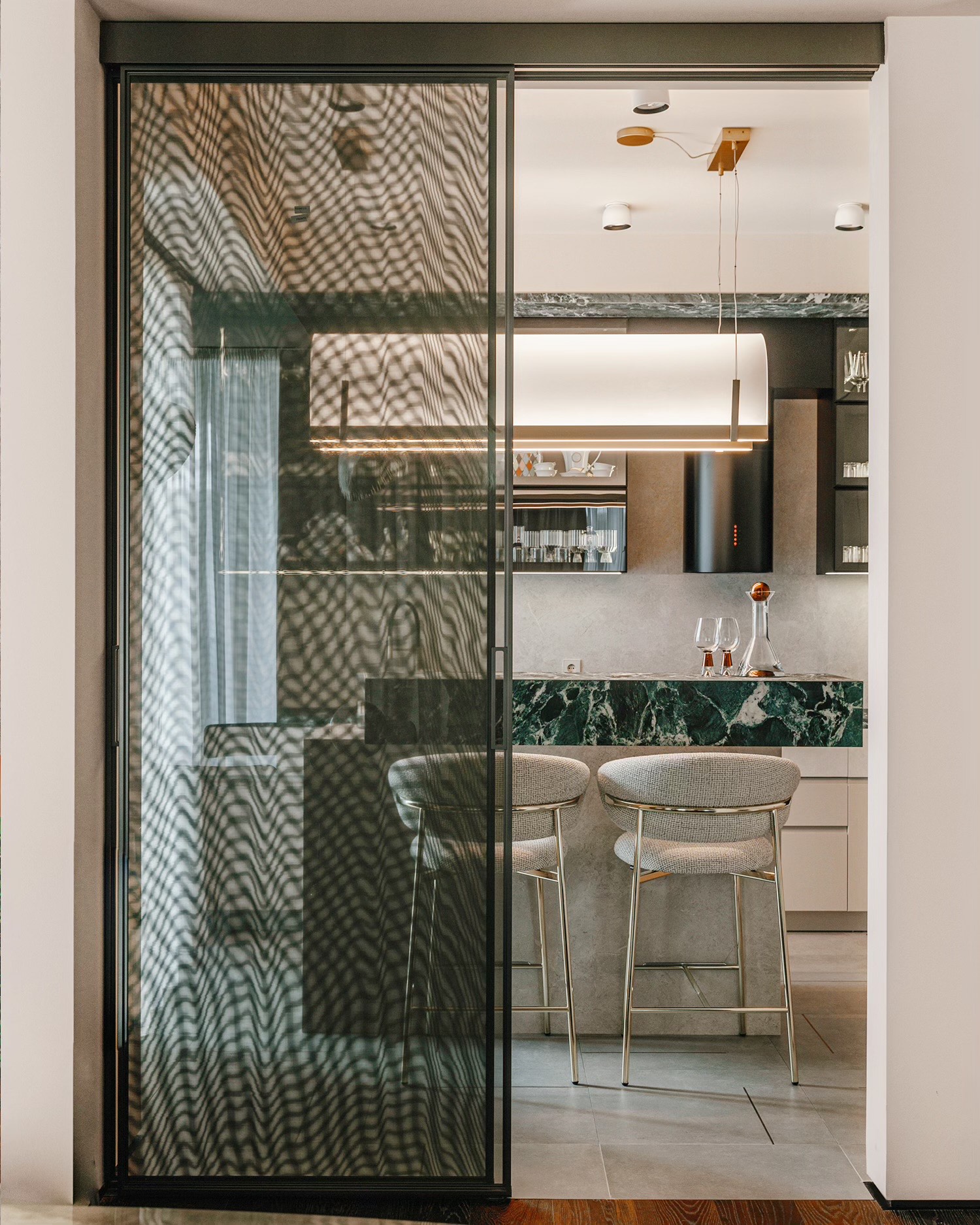დიზაინის კონცეფცია ნატიფი კედლის მოლდინგებით, ფაქიზი ტონებითა და მდიდარი ტექსტურებით აიგო. ამ ელემენტებს ემატება მინიმალისტური დეტალები და ინდივიდუალურად დამზადებული ავეჯი, რაც სივრცეს სიღრმესა და ვიზუალურ დინამიკას სძენს. ბინის მთავარი ზონა — მისაღები ოთახი და სამზარეულო — ერთმანეთს მსუბუქად უკავშირდება Rimadesio-ს მინის სრიალა კარით, რომლის ნაზი მეტალის ბადე სინათლეს ატარებს და სივრცეს დახვეწილ ვიზუალურ უწყვეტობას ანიჭებს.