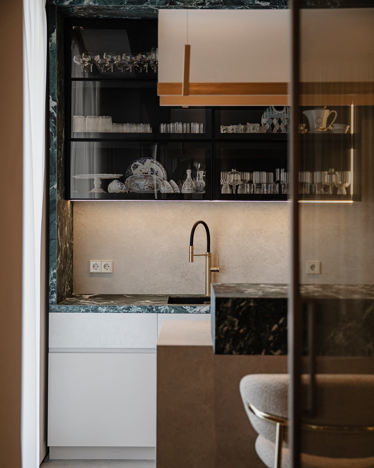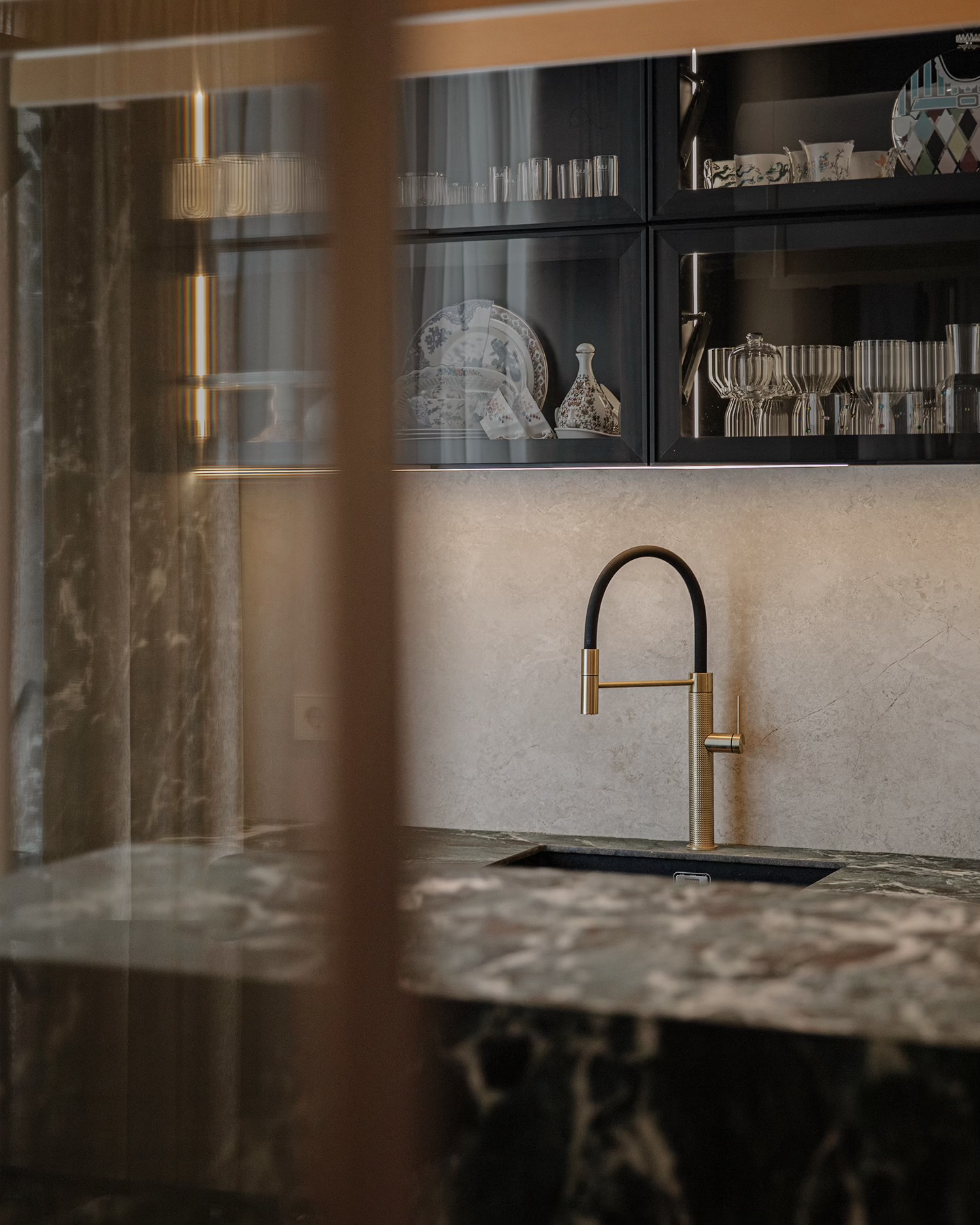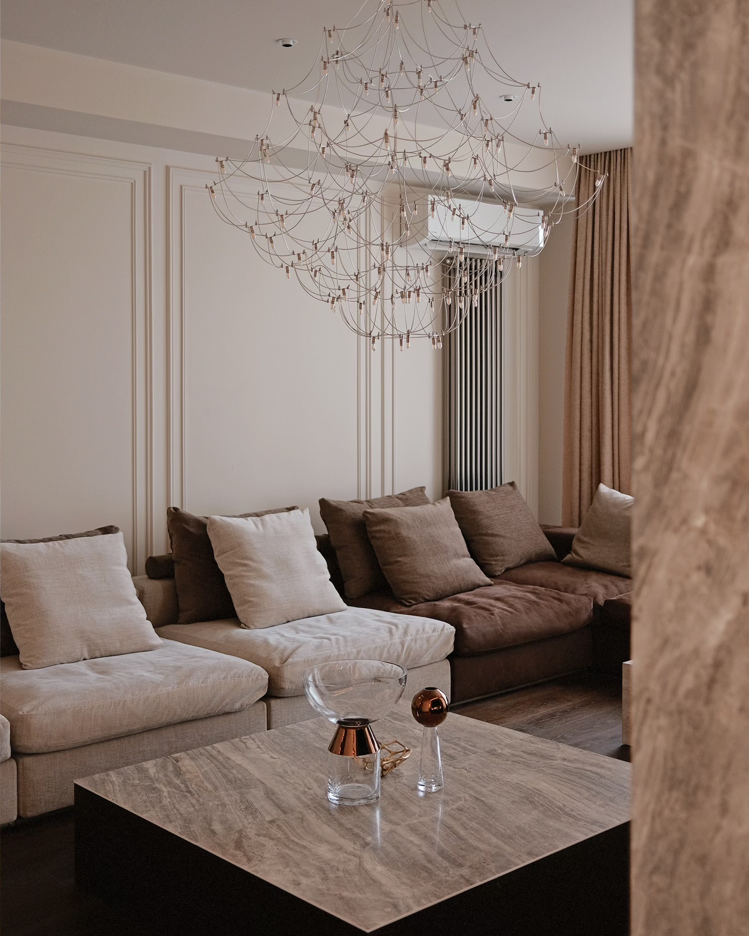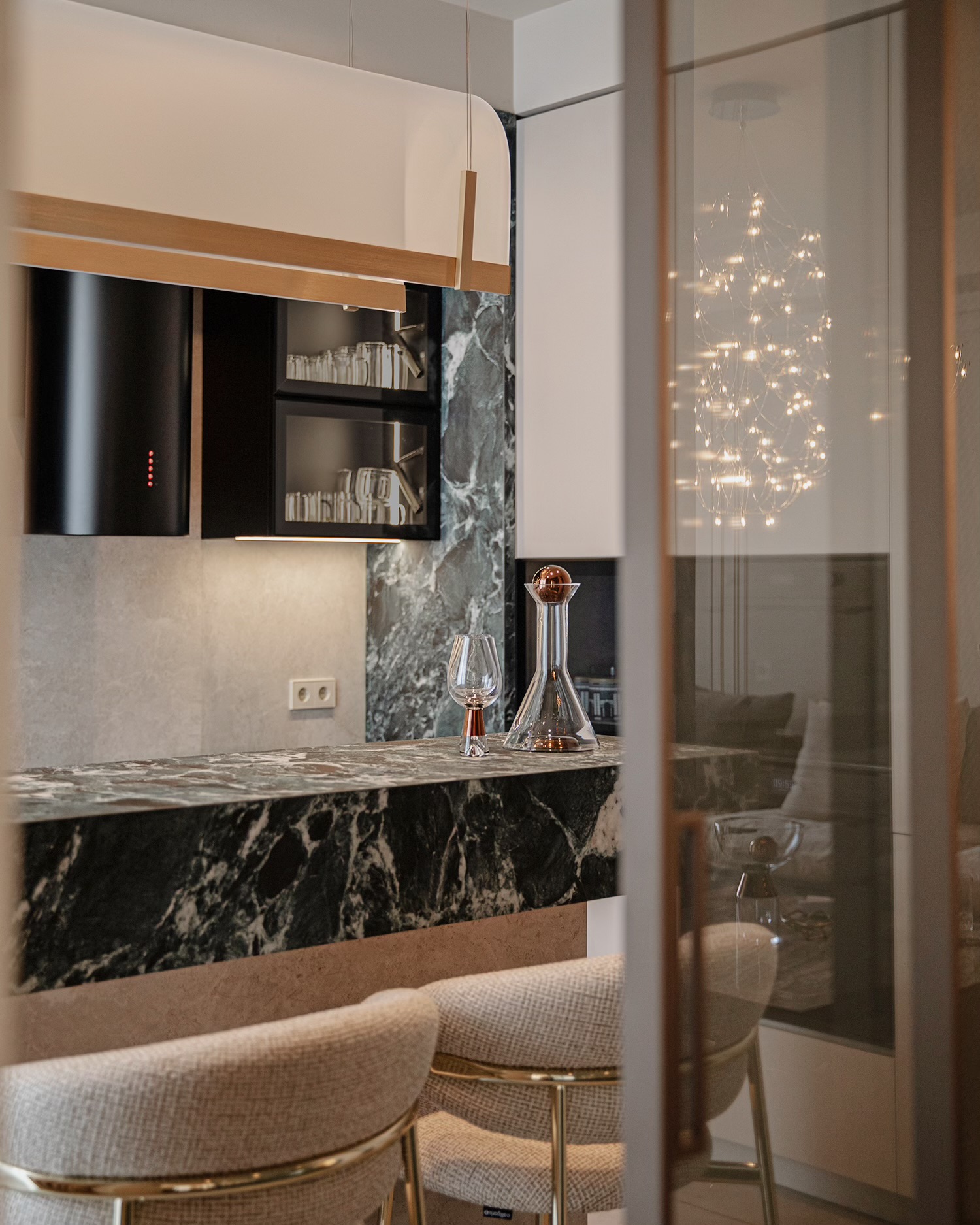 დიზაინის კონცეფცია ნატიფი კედლის მოლდინგებით, ფაქიზი ტონებითა და მდიდარი ტექსტურებით აიგო. ამ ელემენტებს ემატება მინიმალისტური დეტალები და ინდივიდუალურად დამზადებული ავეჯი, რაც სივრცეს სიღრმესა და ვიზუალურ დინამიკას სძენს. ბინის მთავარი ზონა — მისაღები ოთახი და სამზარეულო — ერთმანეთს მსუბუქად უკავშირდება Rimadesio-ს მინის სრიალა კარით, რომლის ნაზი მეტალის ბადე სინათლეს ატარებს და სივრცეს დახვეწილ ვიზუალურ უწყვეტობას ანიჭებს.