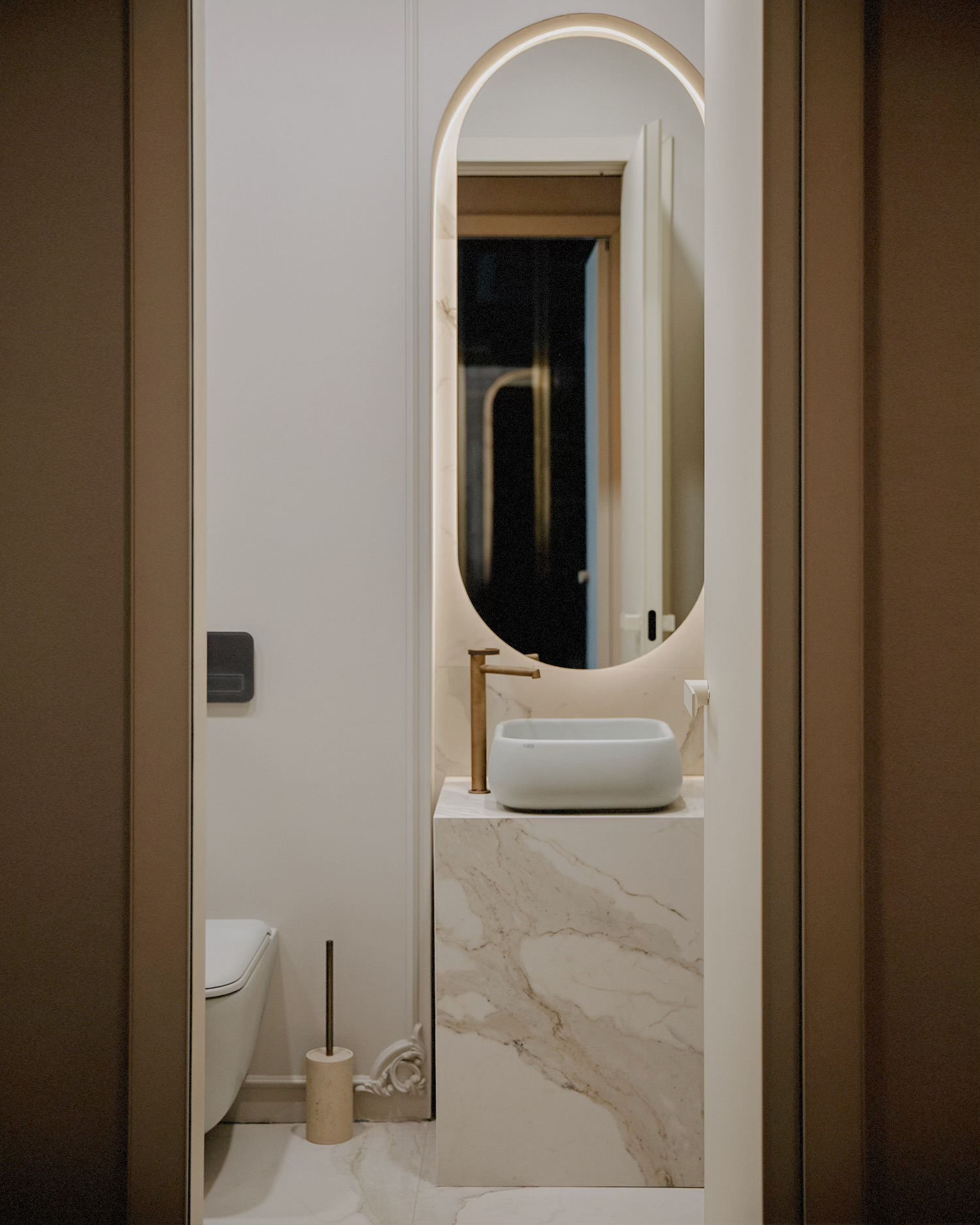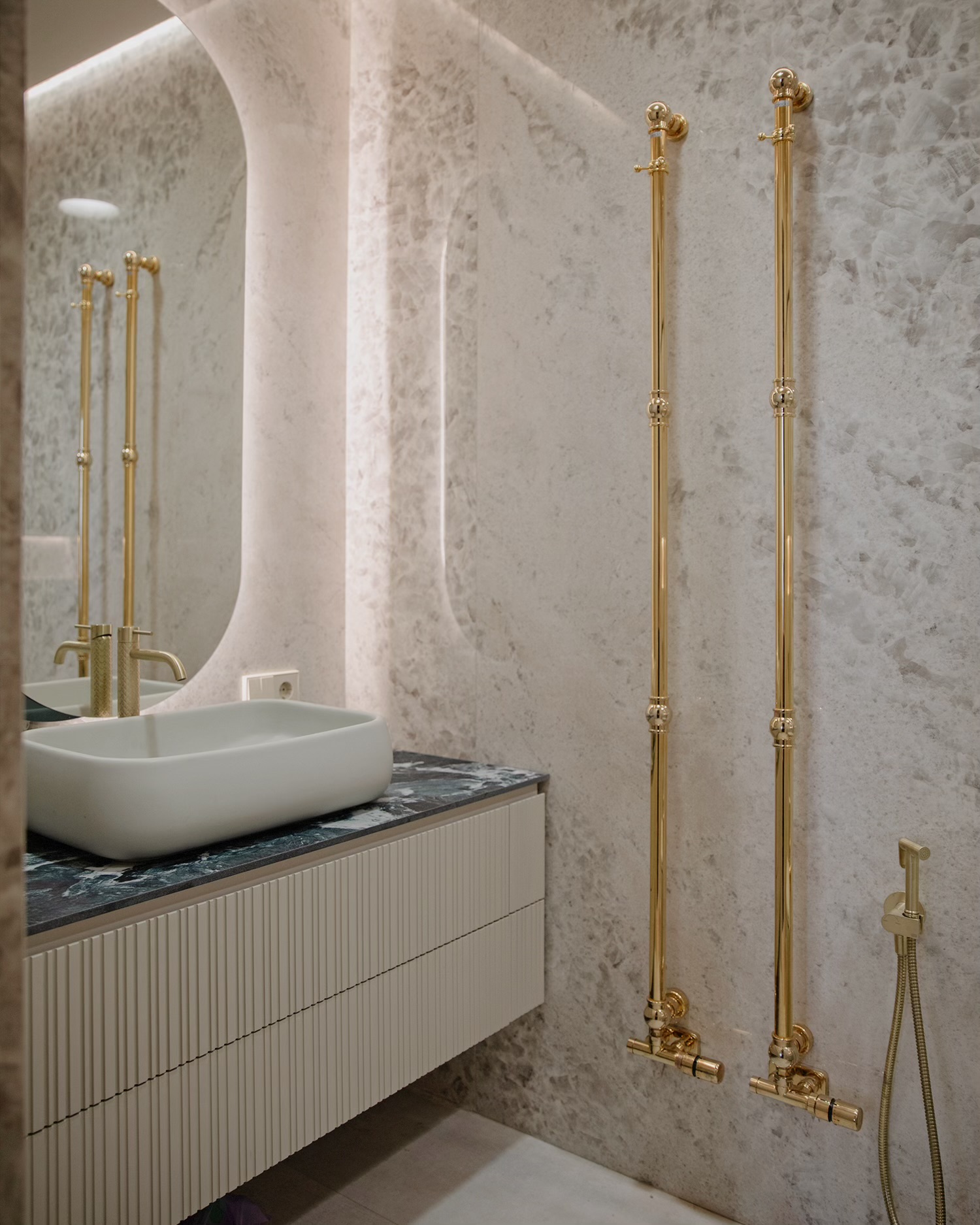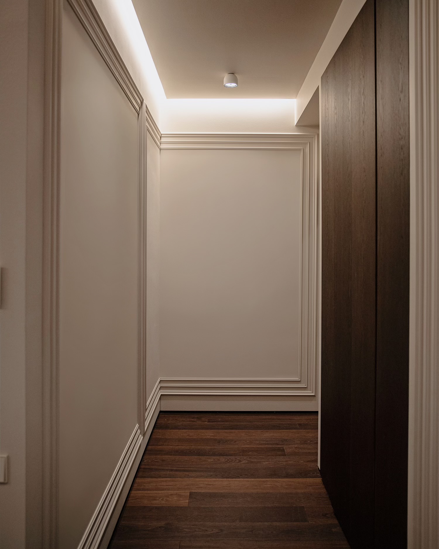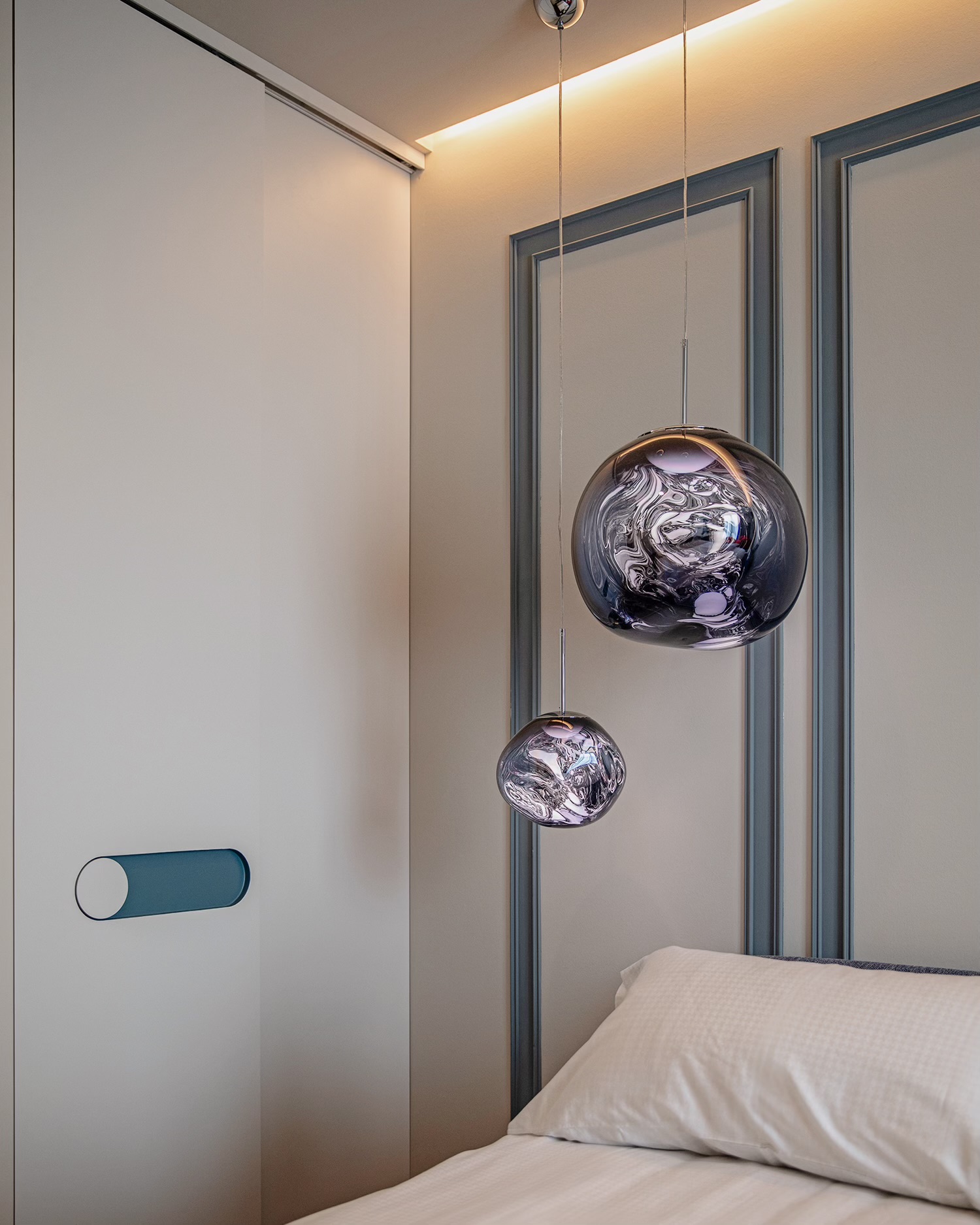 დიზაინის კონცეფცია ნატიფი კედლის მოლდინგებით, ფაქიზი ტონებითა და მდიდარი ტექსტურებით აიგო. ამ ელემენტებს ემატება მინიმალისტური დეტალები და ინდივიდუალურად დამზადებული ავეჯი, რაც სივრცეს სიღრმესა და ვიზუალურ დინამიკას სძენს. ბინის მთავარი ზონა — მისაღები ოთახი და სამზარეულო — ერთმანეთს მსუბუქად უკავშირდება Rimadesio-ს მინის სრიალა კარით, რომლის ნაზი მეტალის ბადე სინათლეს ატარებს და სივრცეს დახვეწილ ვიზუალურ უწყვეტობას ანიჭებს.