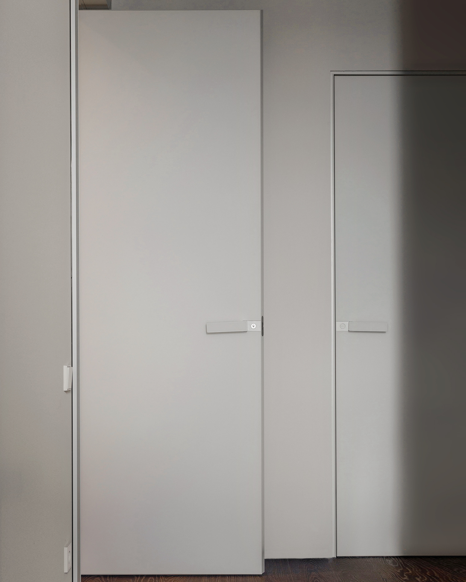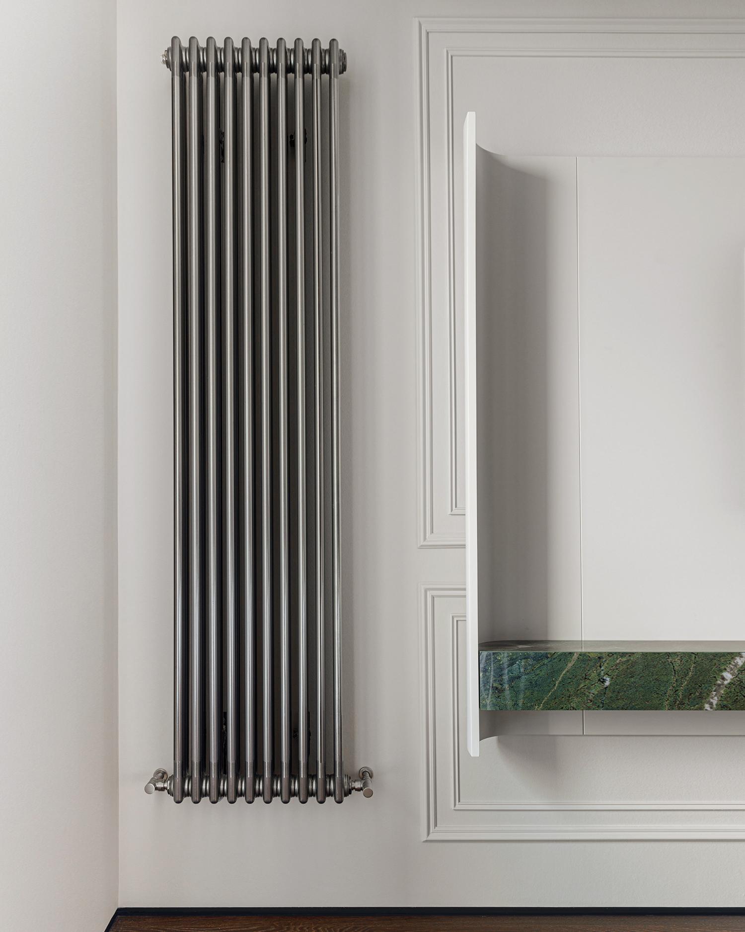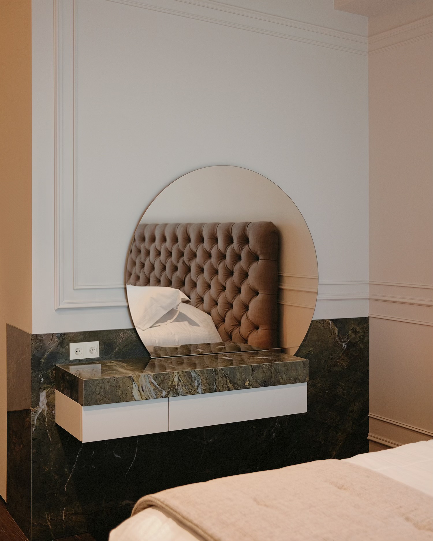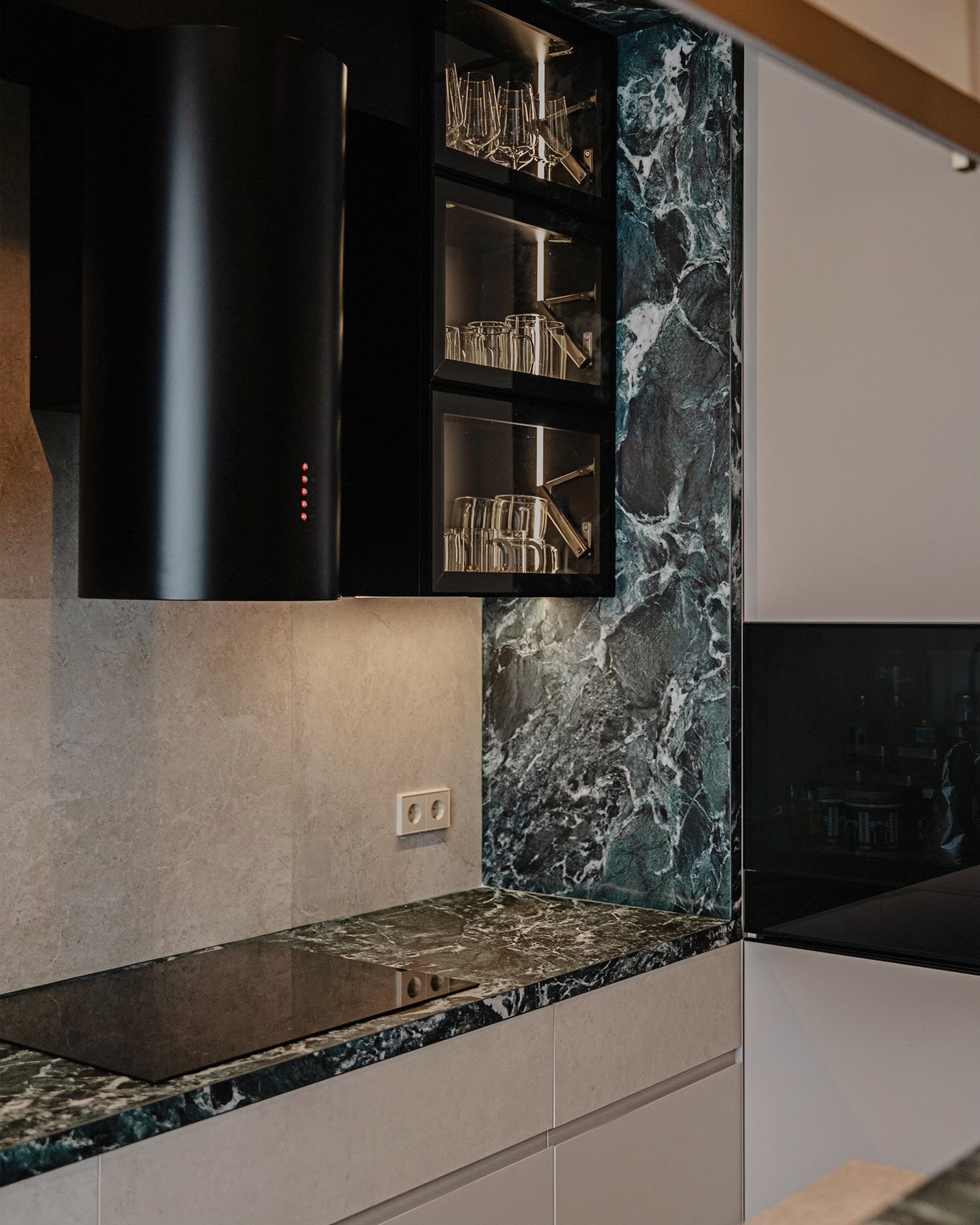 დიზაინის კონცეფცია ნატიფი კედლის მოლდინგებით, ფაქიზი ტონებითა და მდიდარი ტექსტურებით აიგო. ამ ელემენტებს ემატება მინიმალისტური დეტალები და ინდივიდუალურად დამზადებული ავეჯი, რაც სივრცეს სიღრმესა და ვიზუალურ დინამიკას სძენს. ბინის მთავარი ზონა — მისაღები ოთახი და სამზარეულო — ერთმანეთს მსუბუქად უკავშირდება Rimadesio-ს მინის სრიალა კარით, რომლის ნაზი მეტალის ბადე სინათლეს ატარებს და სივრცეს დახვეწილ ვიზუალურ უწყვეტობას ანიჭებს.
