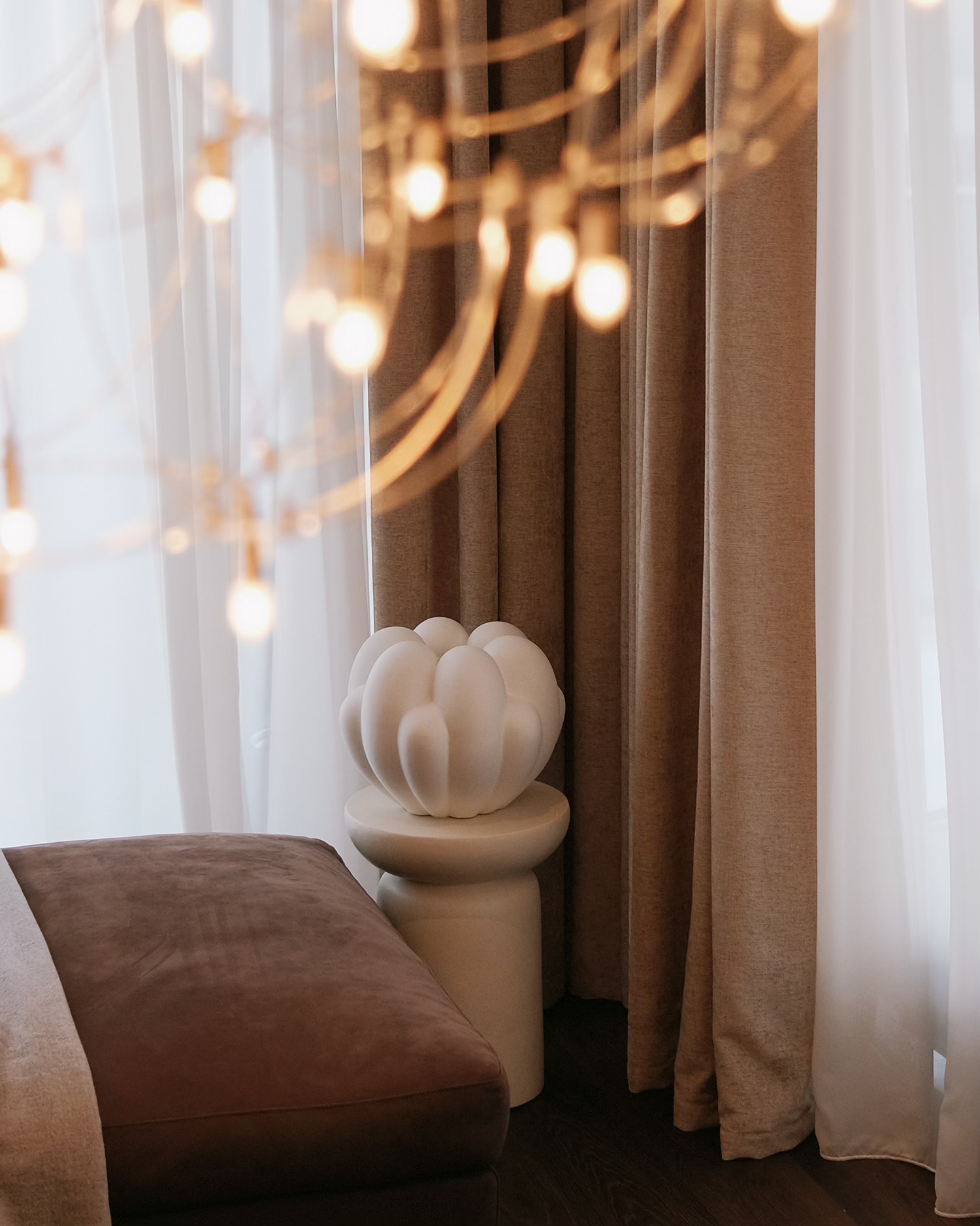 კლასიკურად შედგენილი ინტერიერი თანამედროვე ჭაღებითაა განათებული, რაც ერთგვარ ბალანსს ამყარებს ტრადიციასა და თანამედროვეობას შორის. თითოეულ ოთახში იგრძნობა ფაქიზი კონტრასტების თამაში: რბილი ტონების ფონზე გამოიკვეთება ფორმებისა და მასალების მრავალფეროვნება, რაც არ არღვევს საერთო მთლიანობას.