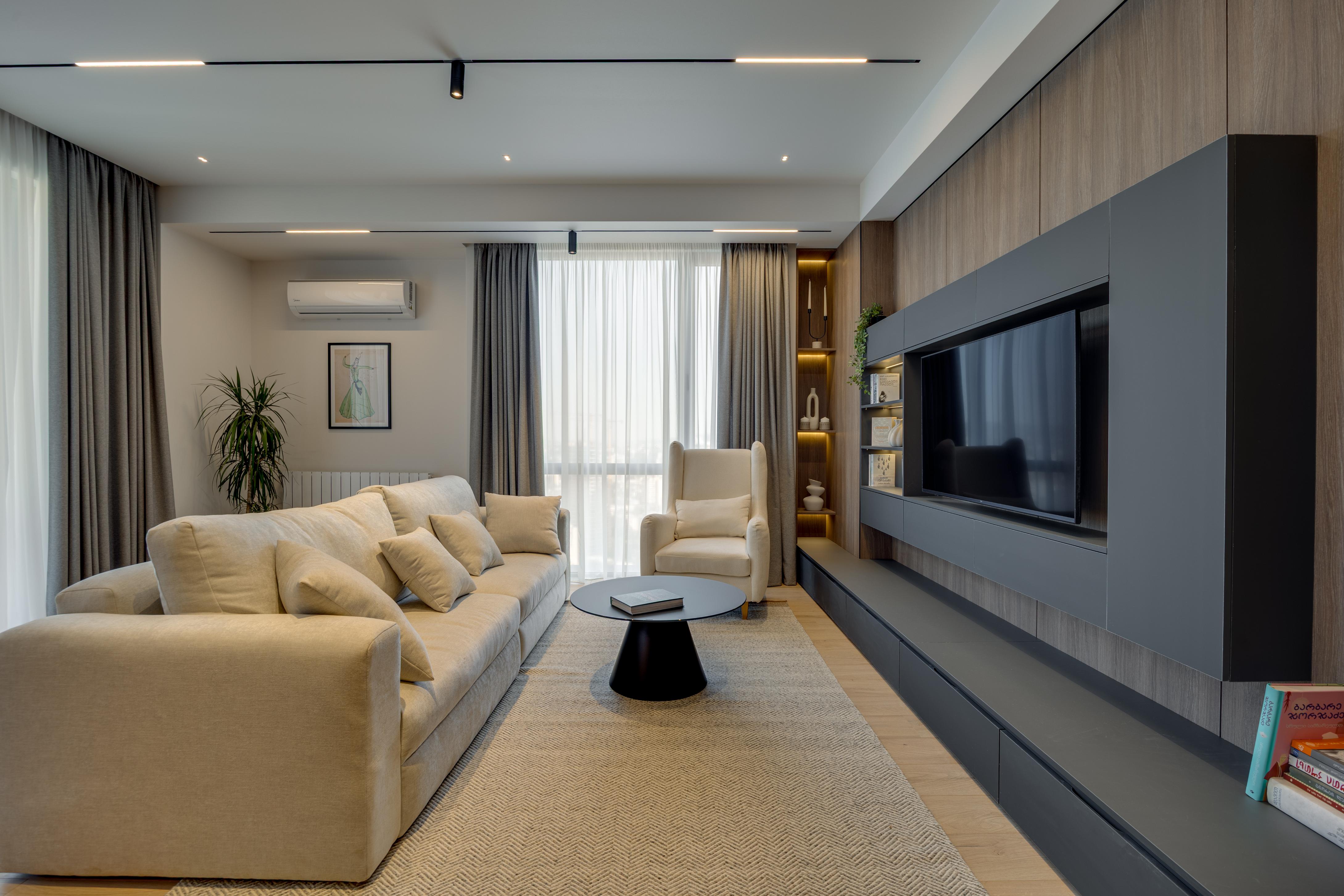 ინტერიერის კონცეფციის საფუძველია ბუნებრივი ფერების პალიტრა — თბილი კრემისფერი, ნაცრისფერი და ხის ბუნებრივი ტონები ქმნის ფონს, რომელზეც მკაფიოდ იკითხება ავეჯის გეომეტრიული ფორმები. ნატურალური ხე აქ ცენტრალური ელემენტია: იატაკზე, ავეჯსა და დეკორატიულ დეტალებში მისი ტექსტურა სიღრმესა და სიცოცხლეს სძენს სივრცეს. მსუბუქი ქსოვილები, რბილი განათება და თანამედროვე ფორმის სანათები ხაზს უსვამს სივრცის მოდერნისტულ ხასიათს და ამავდროულად ინარჩუნებს სიმყუდროვის შეგრძნებას.
