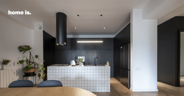 ბინაში ერთ-ერთი გამორჩეული ადგილია სამზარეულო. შავ-თეთრი კუნძული ელეგანტურ შტრიხებს სძენს სივრცეს. შავი ფერის სამზარეულოს ავეჯი, რომელიც მთელ კედელს იკავებს, დომინანტურ თეთრ ტონს აბალანსებს და ინტერიერს მრავალფეროვნებას მატებს. ამ ზონაში ყველა საჭირო ნივთი თუ აქსესუარი სამზარეულოს კარადებშია მოქცეული, რის გამოც სივრცე ერთიანად აღიქმება.
