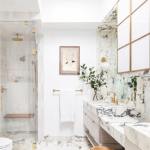 აბაზანა, დამკვეთის სურვილის მიხედვით, მუქ ფერთა პალიტრაშია გადაწყვეტილი, რაც მყუდროებისა და ინტიმურობის განცდას ამძაფრებს. მუქი ტონების გასანეიტრალებლად და ოთახში ბალანსის უზრუნველსაყოფად საშხაპე ნაწილში გამოყენებულია ლურჯი ფილები და ე.წ „rose gold“ შემრევები.