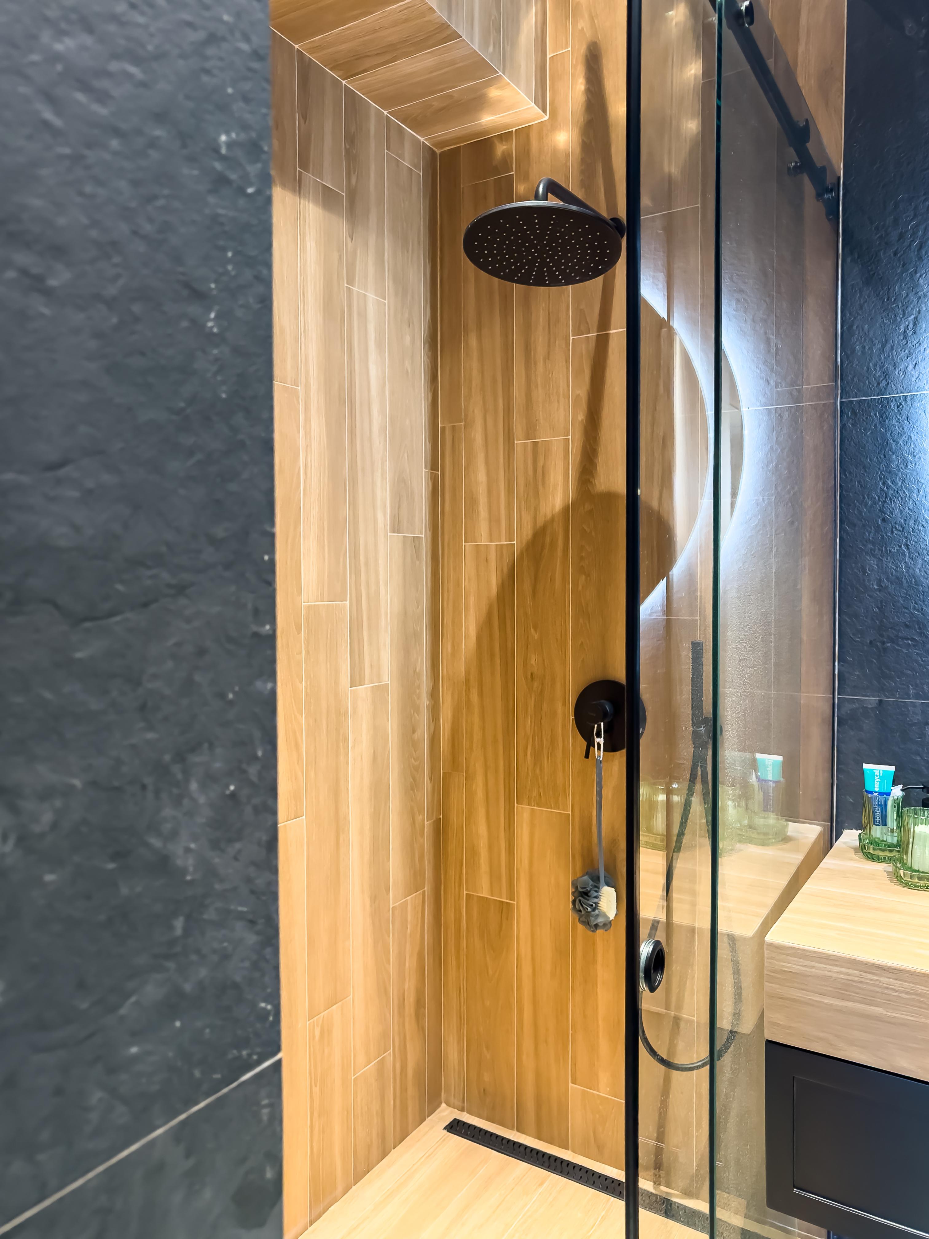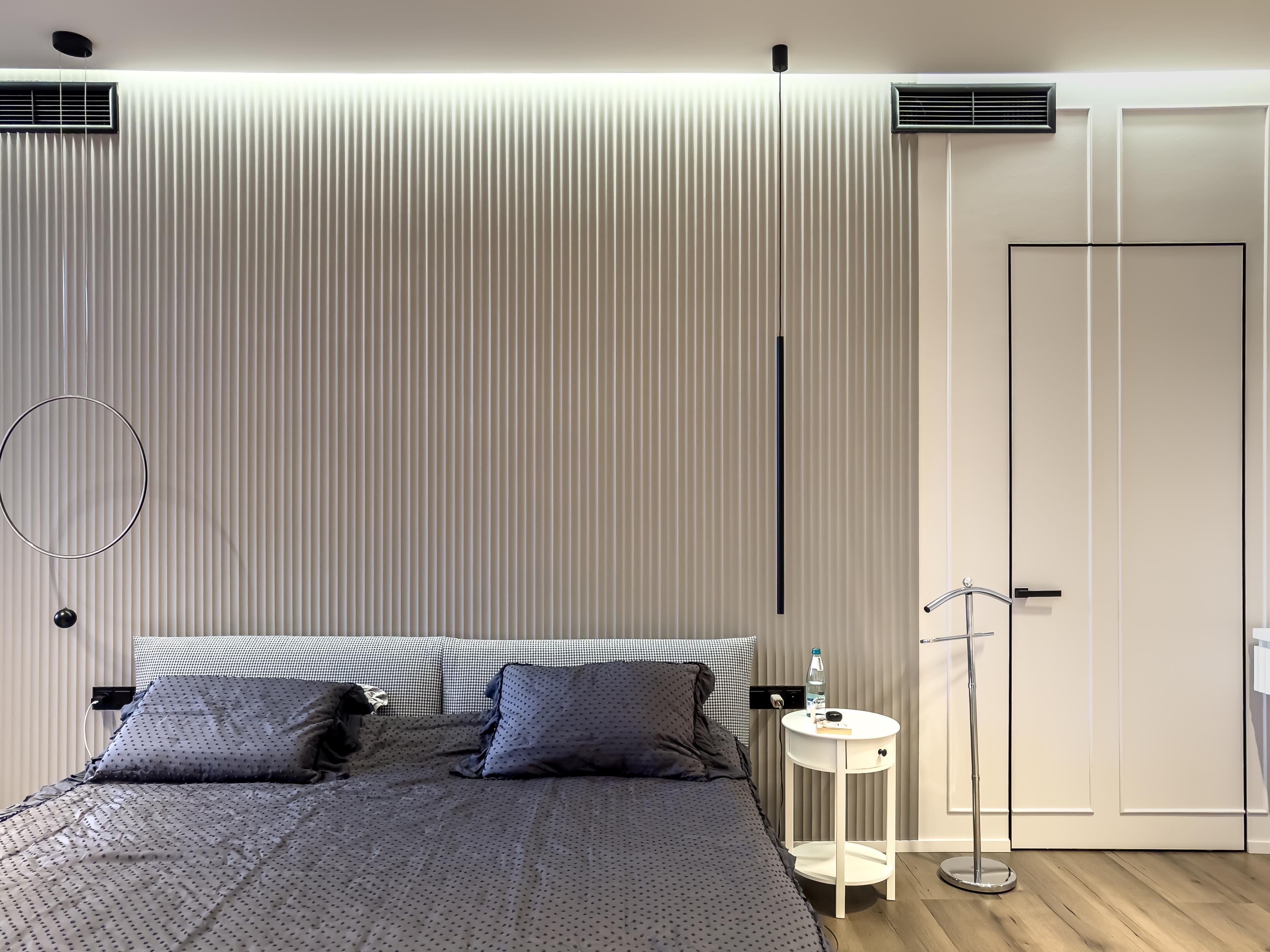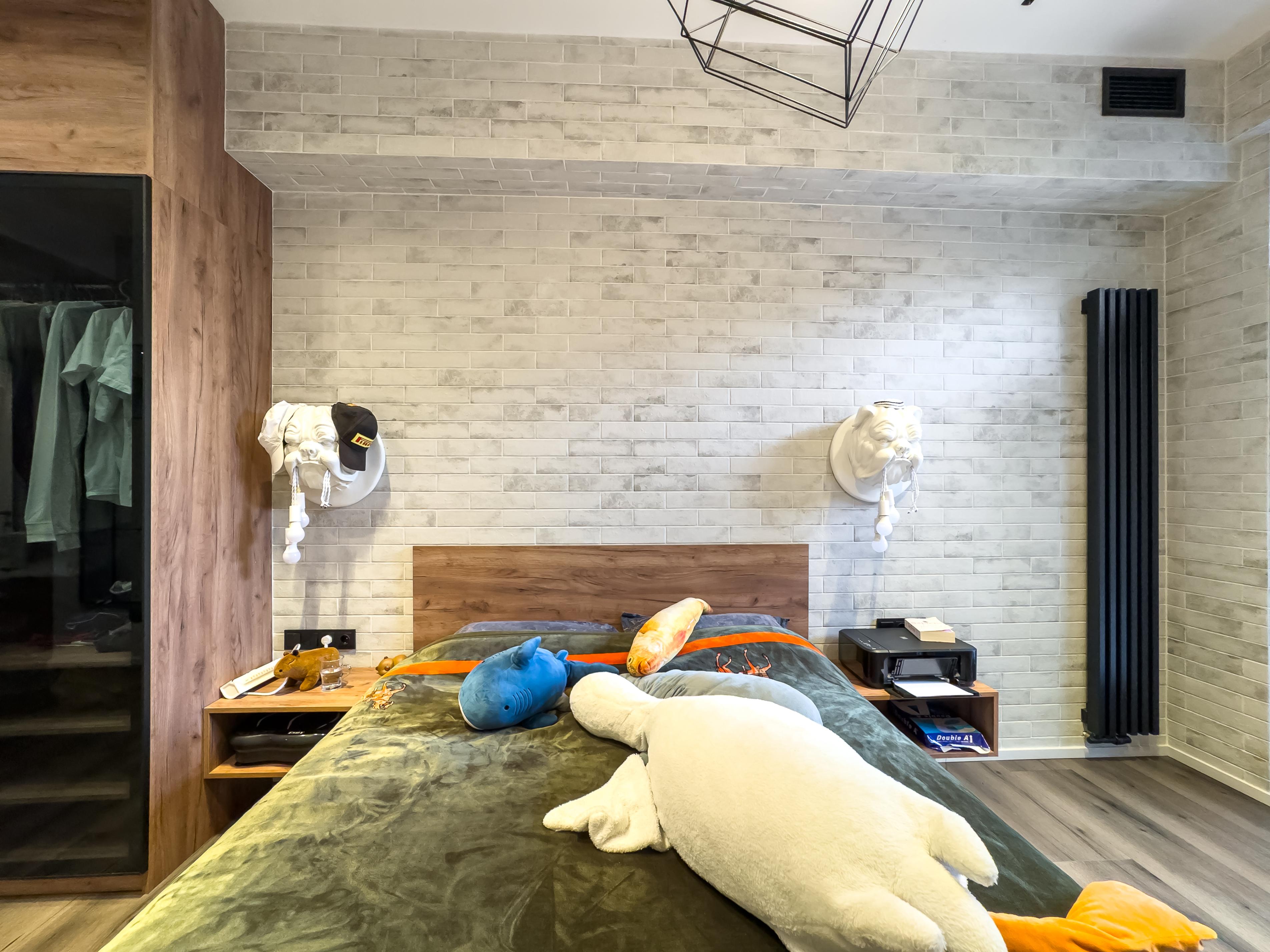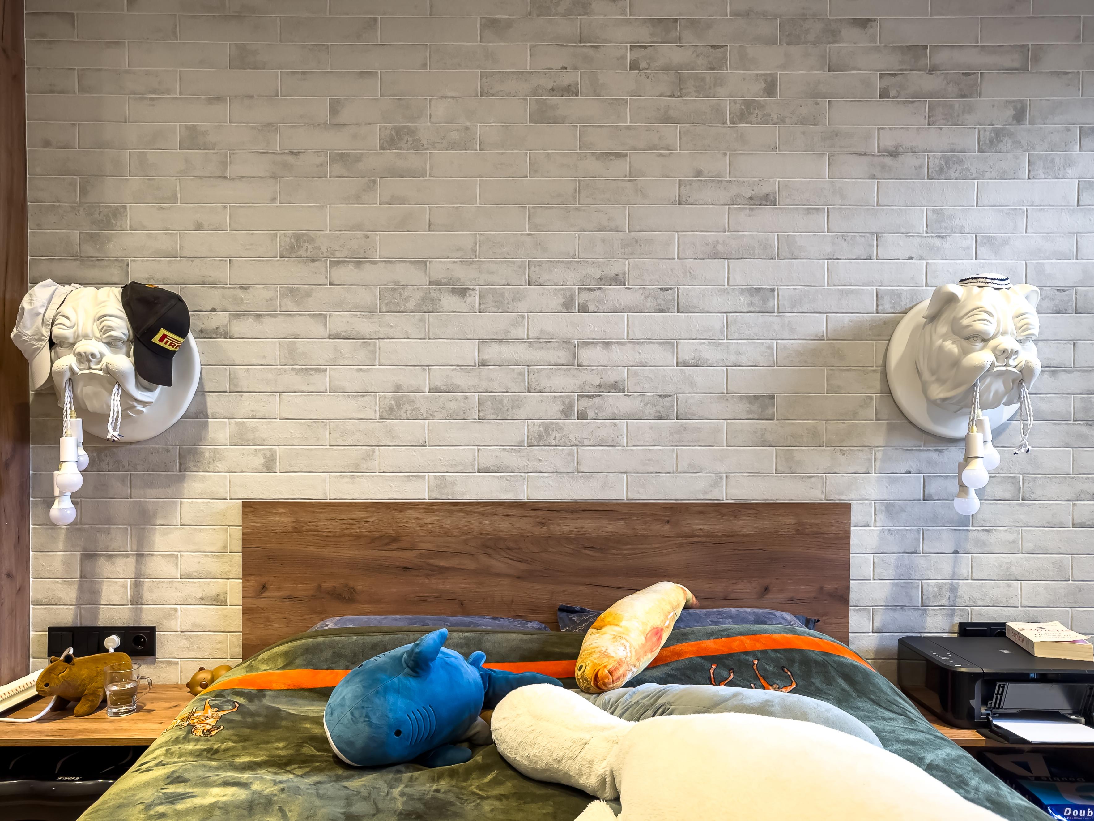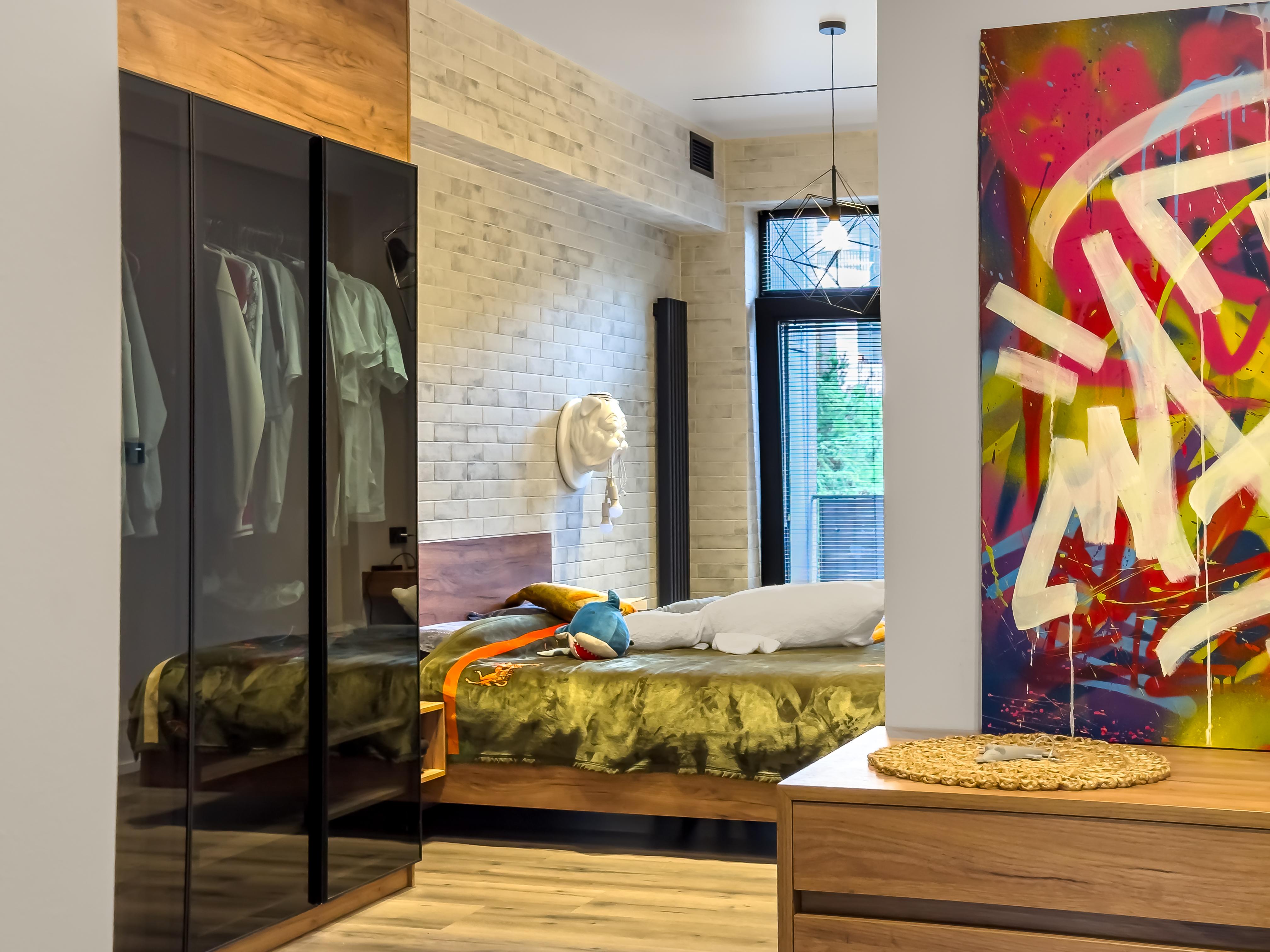 ბინაში ორი მთავარი საძინებელი გვხვდება. მოზარდის საძინებელში დიზაინერმა შეარჩია დაბალანსებული გადაწყვეტა: შავი მქრქალი და ღია ხის ტონალობის კერამოგრანიტი სველ წერტილში, ხოლო თეთრი-მონაცრისფრო აგური და ღია ხის ელემენტები — საძინებელში.