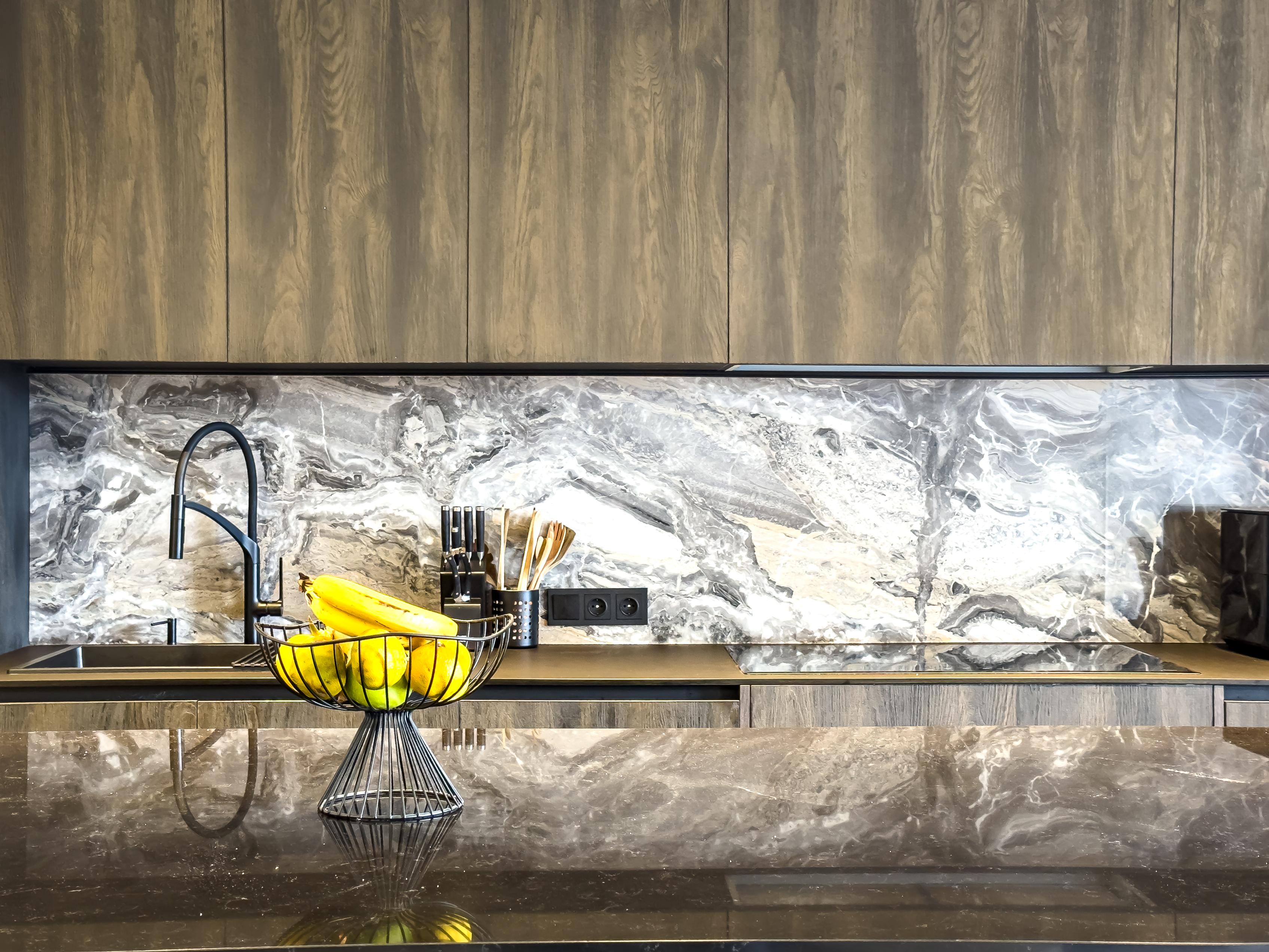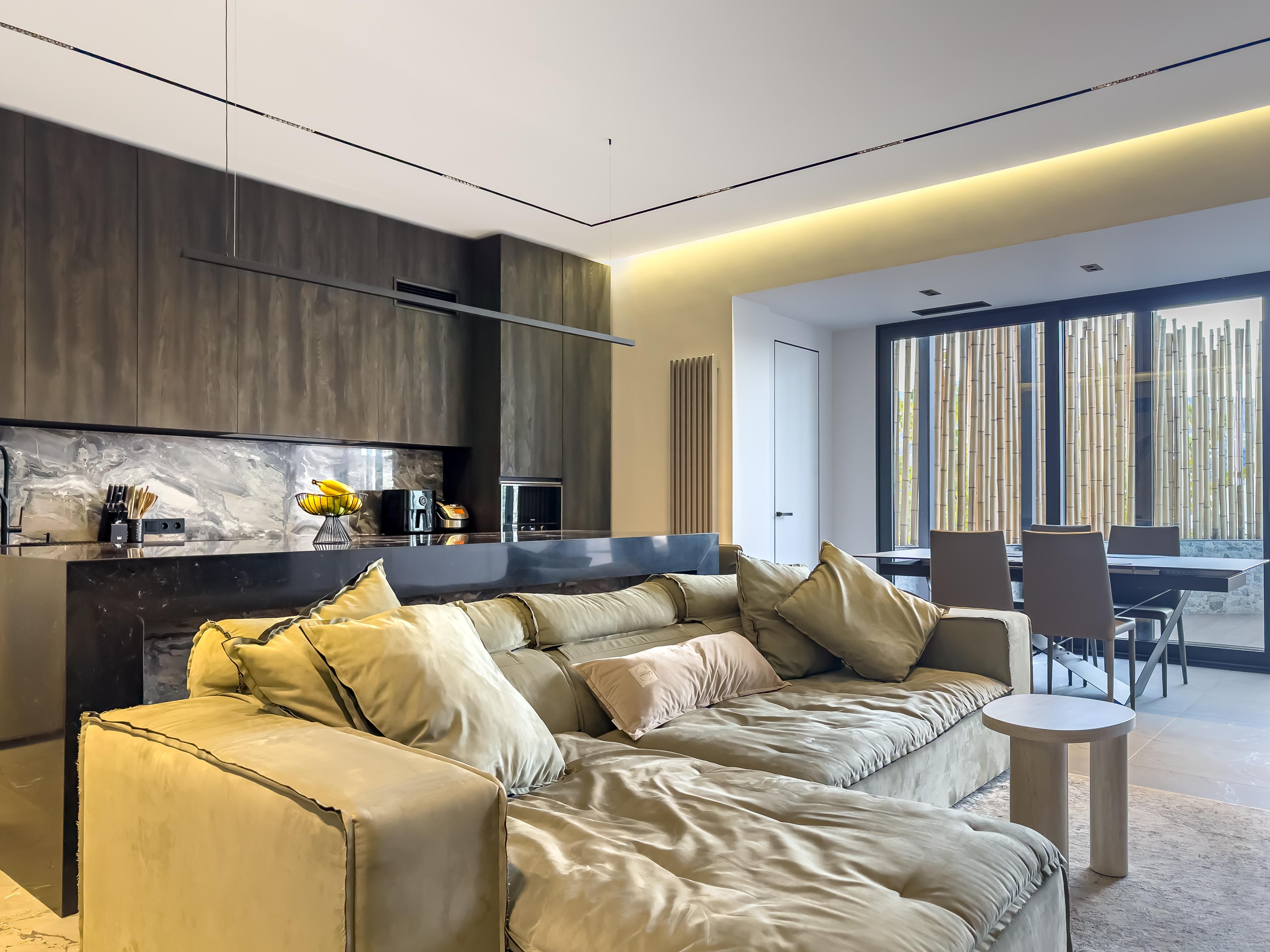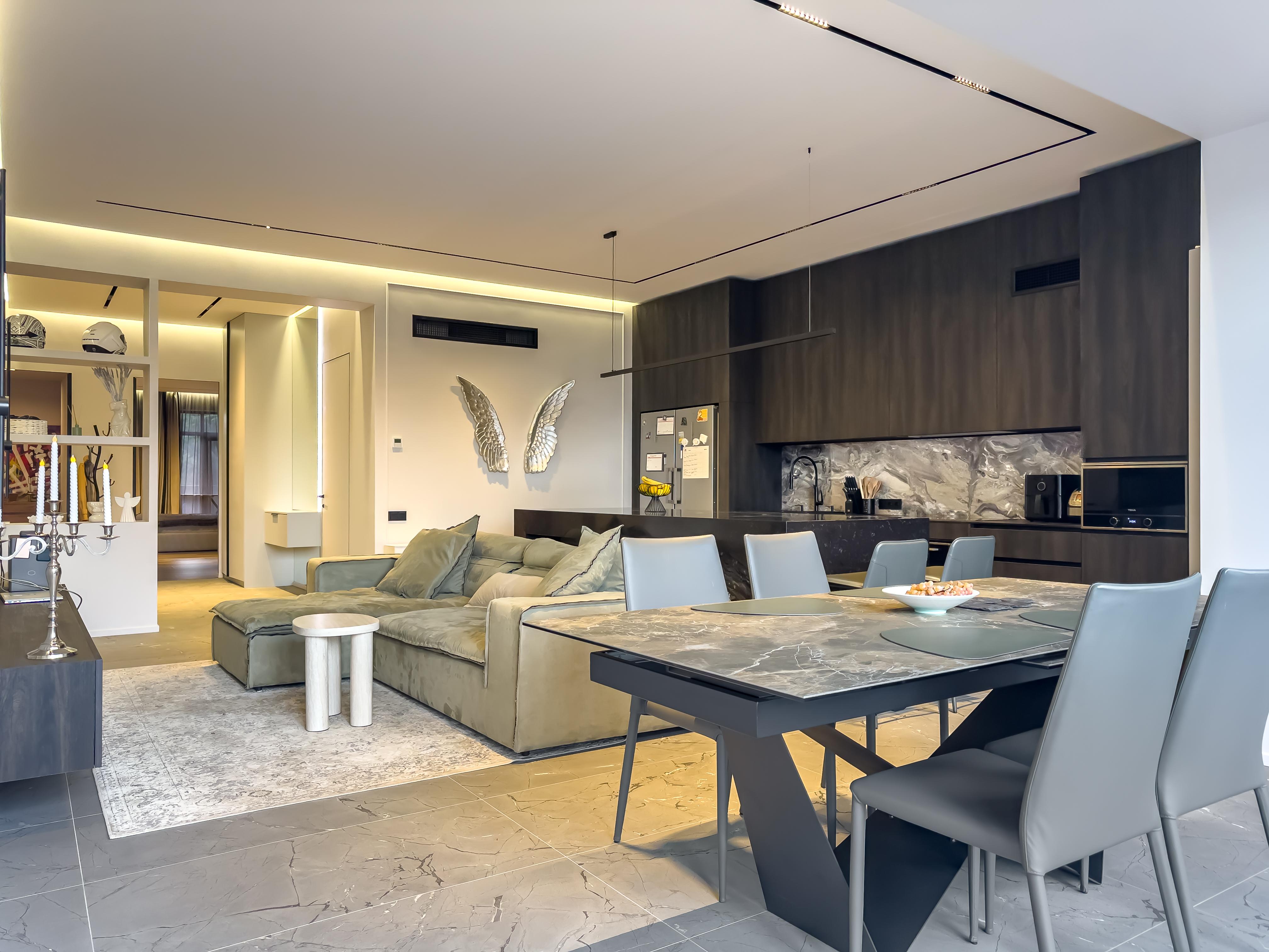 პროექტის ავტორმა კონცეფცია სწორედ ამ პარამეტრების გათვალისწინებით დაგეგმა. სიმყუდროვისა და სითბოს შესაქმნელად გამოყენებულ იქნა ყავისფერი დეტალები ავეჯის, ქვის ტექსტურებისა და სამზარეულოს ფასადების სახით. ცივი ფერების დასაბალანსებლად ინტერიერში დამატდა ე.წ. ზეთისხილის მწვანე ტონის მქონე რბილი ავეჯი და სკამები. ხოლო დეკორატიული ელემენტის სახით, კედლებზე მინიმალური ფორმის მოლდინგებია გამოყენებული.