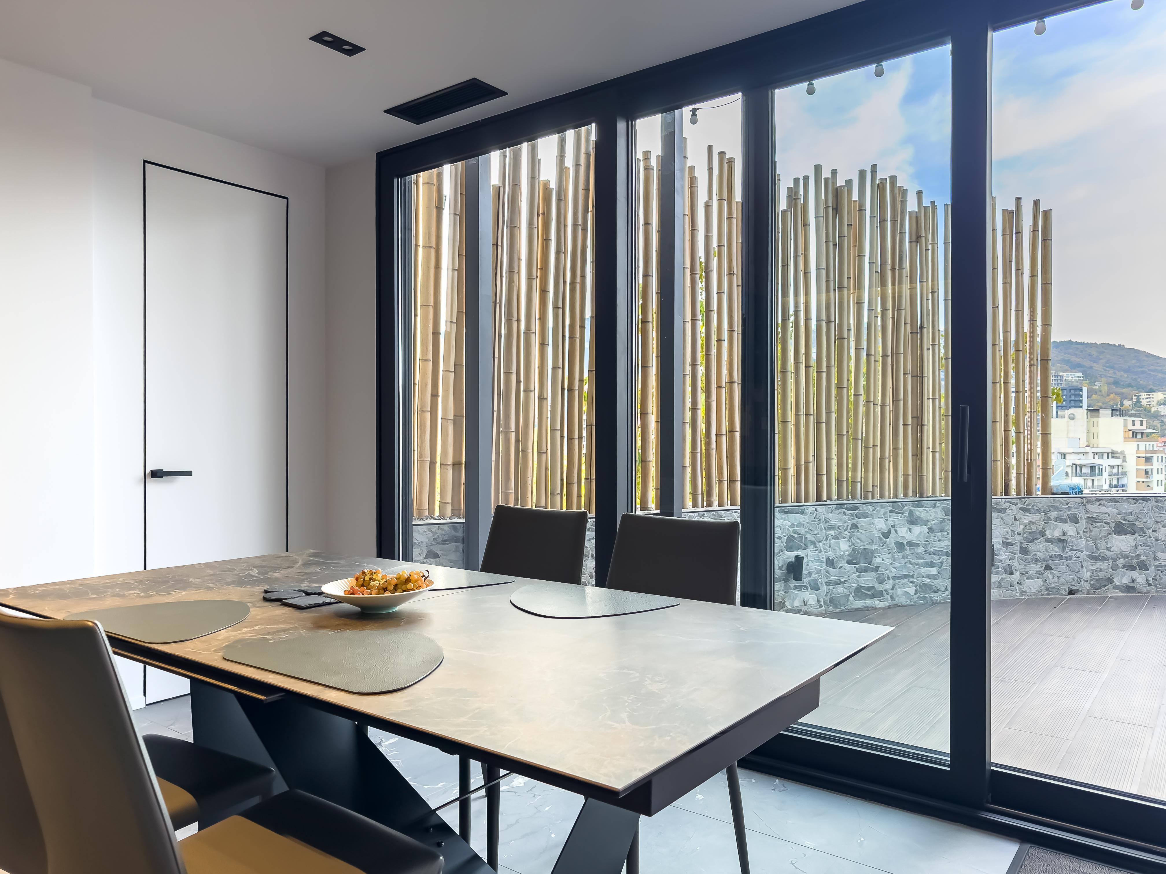 სასადილო ზონასთან არსებული ტერასა ბუნებრივი განათების მთავარი წყაროა, თუმცა მეზობელი შენობის სიახლოვემ საჭირო გახადა სივრცის ვიზუალური დაცვა, რაც ბამბუკის ლერწამით განხორციელდა. ხის ფაქტურამ ინტერიერს დამატებითი სითბო შემატა.