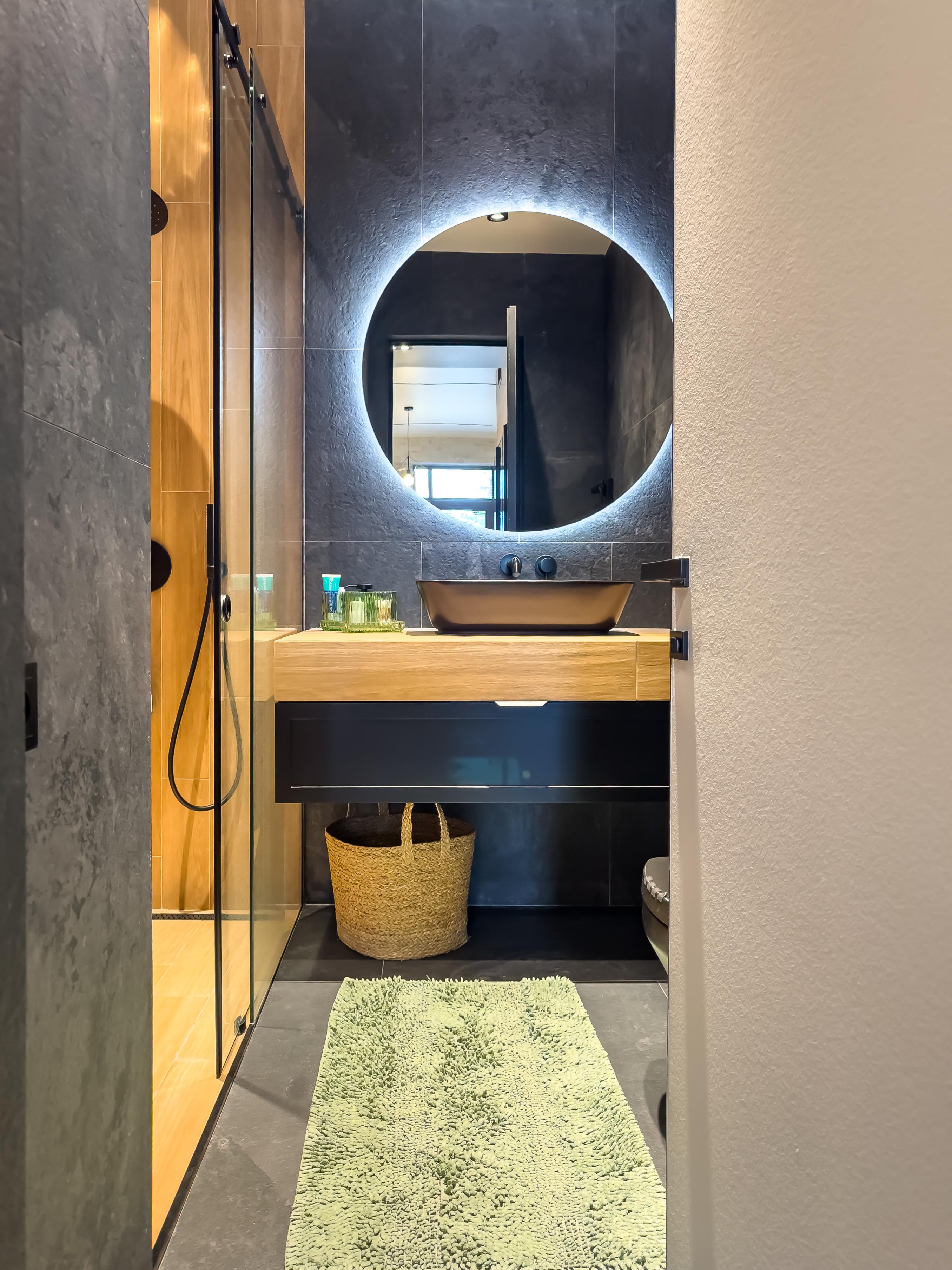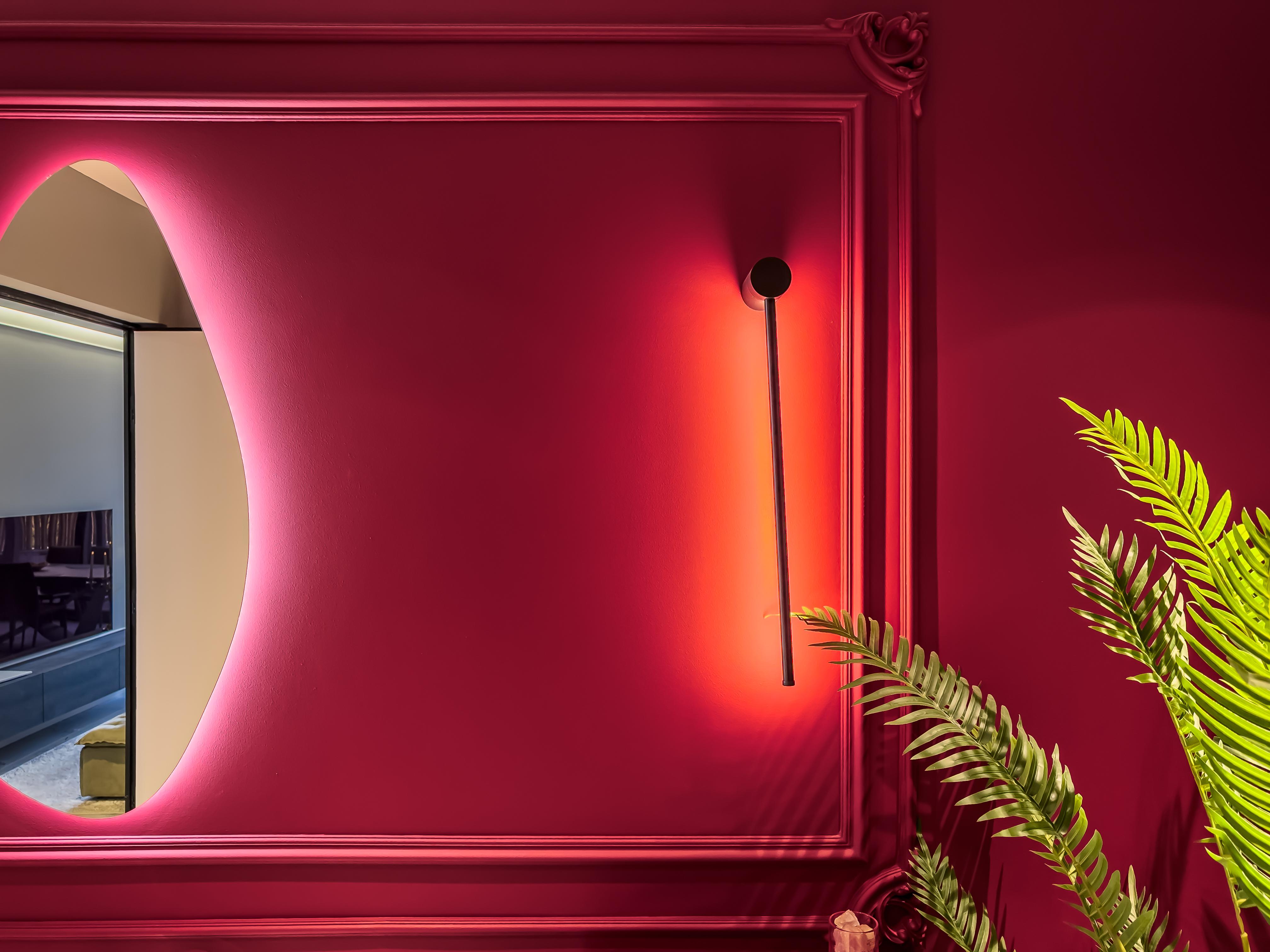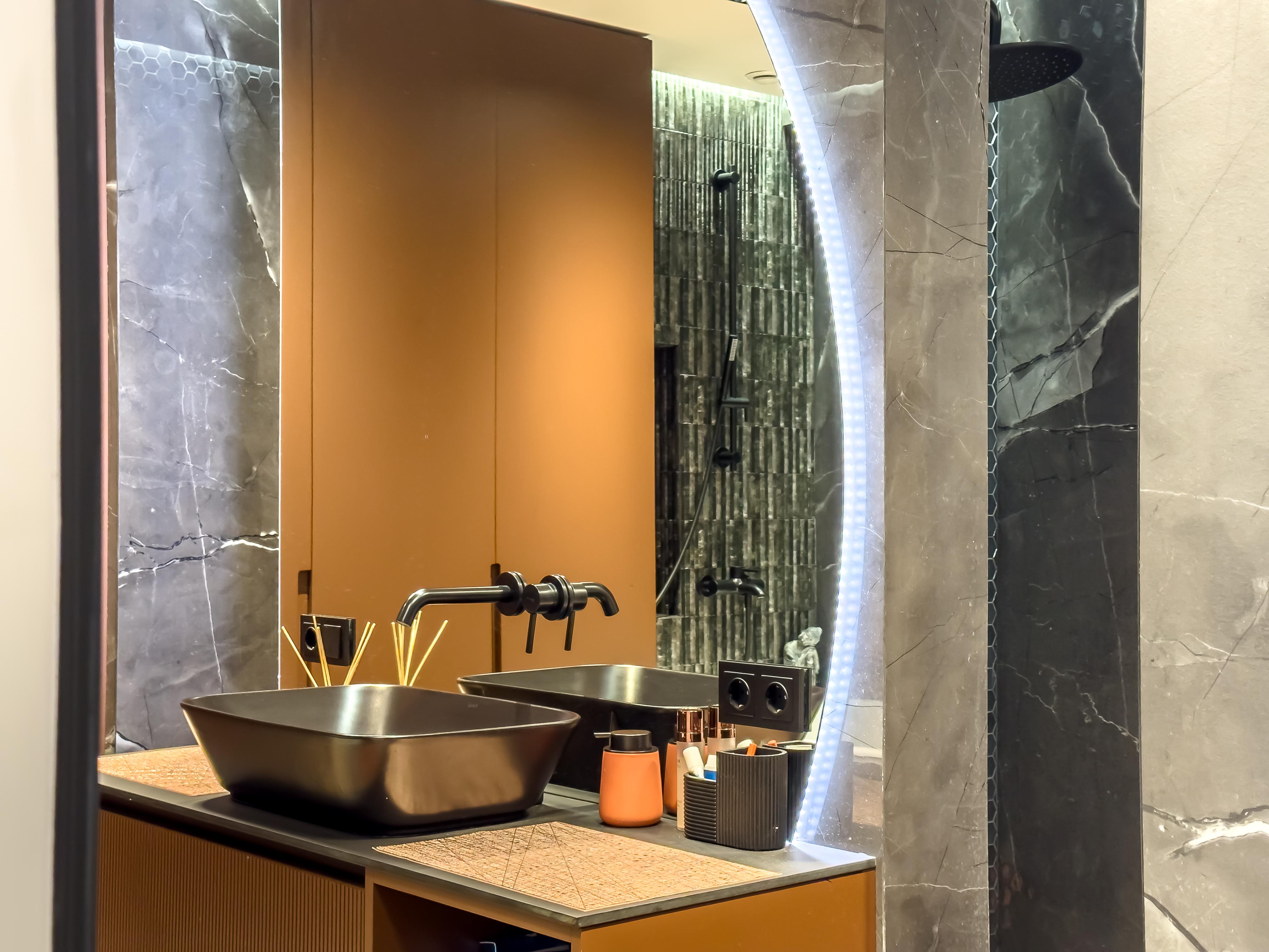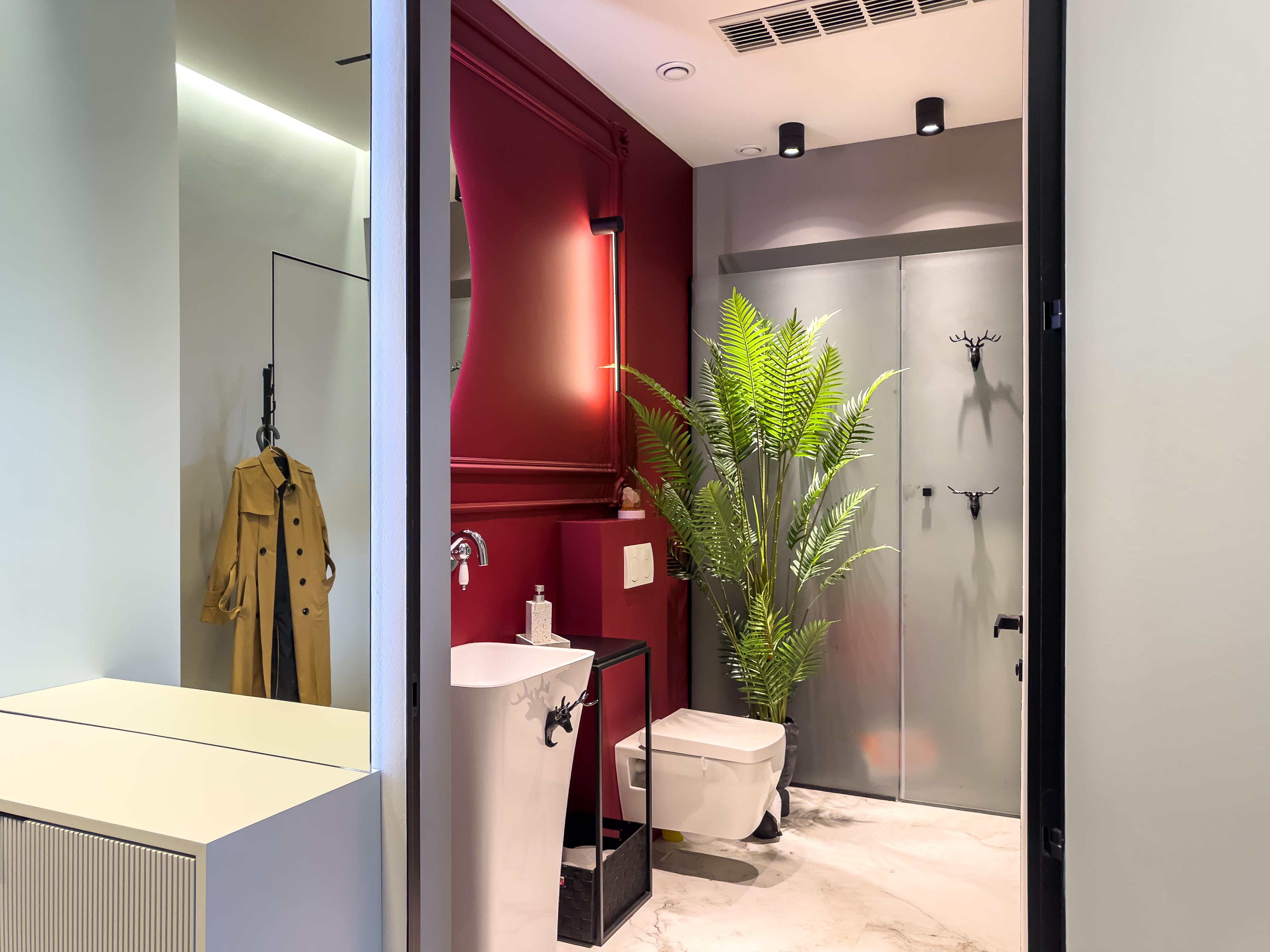ამას გარდა, მოეწყო დამოუკიდებელი სტუმრის სველი წერტილი, რომელშიც დიზაინერმა საინტერესო ექსპერიმენტის განხორციელება შეძლო — ნინო გორგილაძემ ამ სივრცეში წითელი კედელი და ასიმეტრიული სარკე გამოიყენა, რაც დანარჩენ ინტერიერთან კონტრასტში მოდის და საკმაოდ დიდ შთაბეჭდილებას ახდენს.