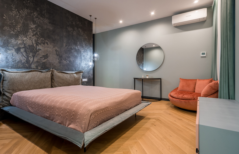 სახლის ორი საძინებლიდან ეს ერთ-ერთია, სადაც გამოყენებულია მუქი ფერის შპალერი, ასევე თითქმის შეუმჩნეველი პრინტებით. ეს შპალერი ერთგვარად კონტრასტს ქმნის ოთახში გამოყენებულ სხვა ფერებთან.