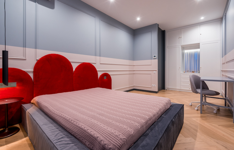 ეს კი მეორე საძინებელია, სადაც, პირველ რიგში, თვალში საძინებლის წითელი, ხავერდოვანი თავი გვხვდება. სხვა ოთახებისგან განსხვავებით, აქ შპალერის მაგივრად გამოყენებულია მოლდინგები და ორი ფერის საღებავი, რომლებიც ასევე გვხვდება ოთახის სხვა ელემენტებში.