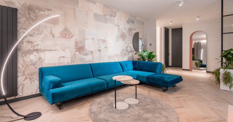 მისაღები სივრცის ყველაზე დიდ ღირსებას ლურჯი, ხავერდოვანი დივანი წარმოადგენს, რომელიც ერთგვარად კონტრასტს ქმნის ამავე სივრცეში გამეფებულ ნეიტრალურ ფერებთან. საინტერესოა, რომ არამხოლოდ მისაღებში, არამედ მთლიან სახლში დიდი ყურადღება მიექცა შპალერებს, რომლებიც თან ნეიტრალურია, თან – სადა. თითქმის ყველა ოთახში მათზე დატანილია შეუმჩნეველი პრინტები, რაც სივრცეს კიდევ უფრო ამდიდრებს.