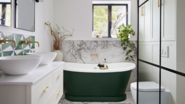 აბაზანაში გვხვდება ცისფერი აქცენტები, რომლებიც ოთახს ფერადოვნებასა და სიხალისეს ჰმატებს. მიუხედავად იმისა, რომ სივრცე ძალიან პატარაა, აქ ყველა ფუნქციური ზონაა წარმოდგენილი.
