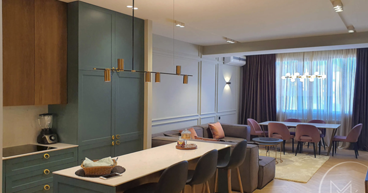 ინტერიერის დიზაინის კუთხით, გათვალისწინებული იქნა ბინის მეპატრონის ხასიათი და გემოვნება, რამაც განაპირობა ისეთი კლასიკური და თანამედროვე ელემენტების შემოტანა, როგორიც არის კედლის მოლდინგები, ბუნებრივი ქვის ვიზუალის მქონე პრიალა ფილები, დახვეწილი შავი და ოქროსფერი დეტალები.