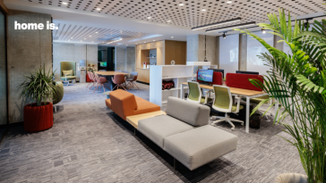 მოსაცდელში ორიგინალური ფორმის ფირუზისფერი ტახტი დგას, რომელიც ხის ფაქტურის ელემენტებით არის გაფორმებული. ასევე დეკორატიულ ელემენტად გვევლინება ბუნებრივი გამწვანებაც, რომელიც ავეჯის ტონალობას ჰარმონიულად ეხამება.