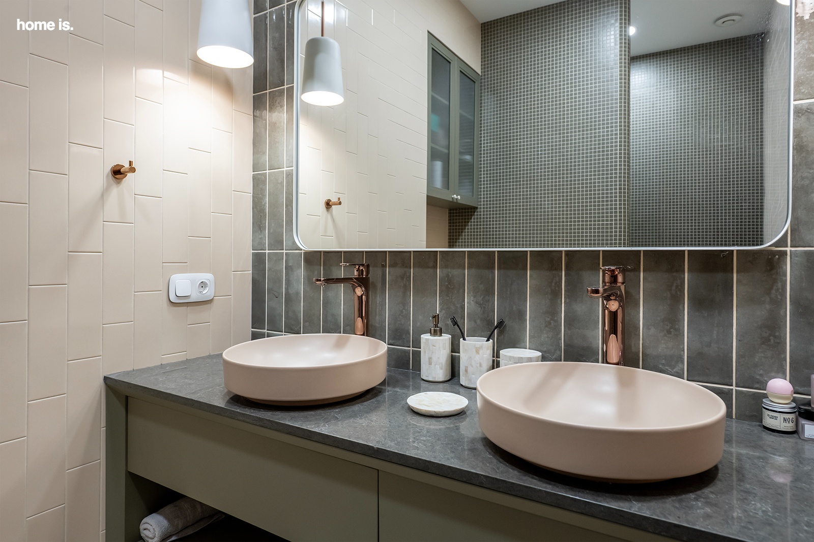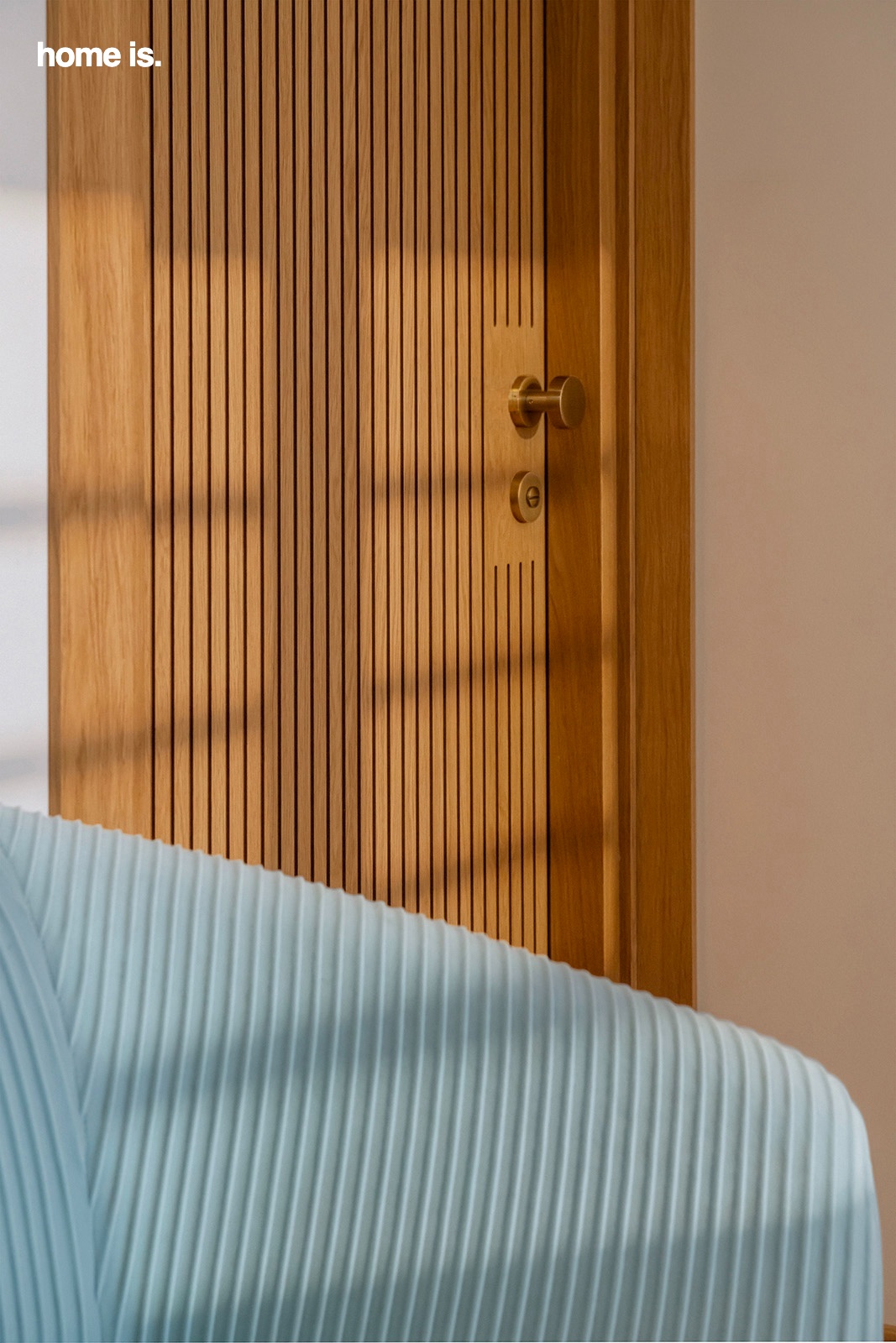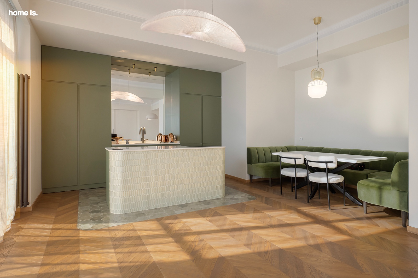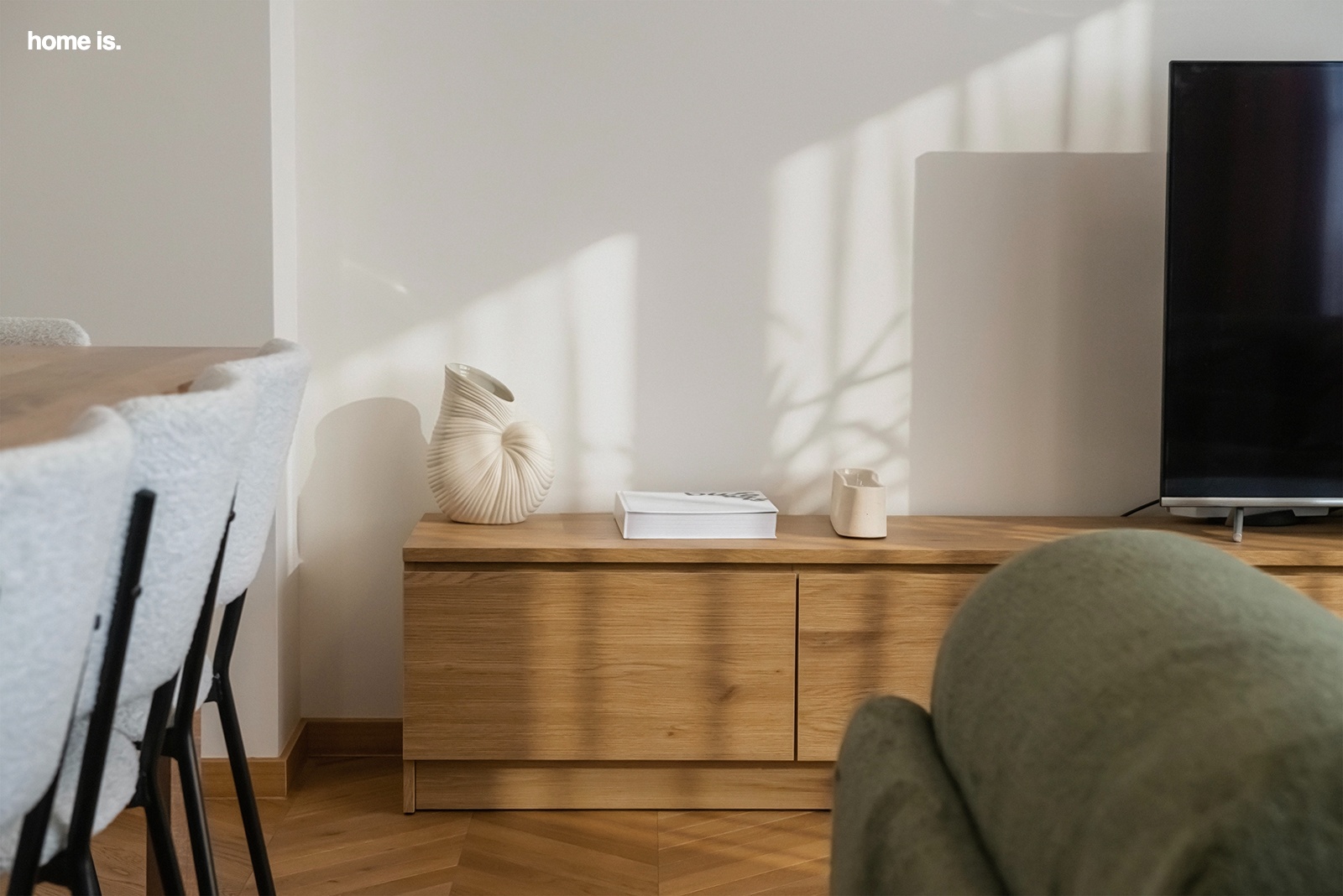 ინტერიერის ფერთა პალიტრა აგებულია ბუნებრივ ტონებზე — დომინირებს მწვანე და ღია ხის ფერი, რომლებიც სივრცეს სითბოსა და ბუნებრივ ხასიათს სძენს. ეს არჩევანი არა მხოლოდ ვიზუალურ კომფორტს უზრუნველყოფს, არამედ ბინას დროში გამძლე და უნივერსალურ იერს ანიჭებს. ბუნებრივი ფერები აქ არ არის მხოლოდ დეკორატიული ელემენტი — ისინი სივრცის მთავარ კონცეფციას ქმნის და ცხოვრების ყოველდღიურ რიტმს ორგანულად ერწყმის.