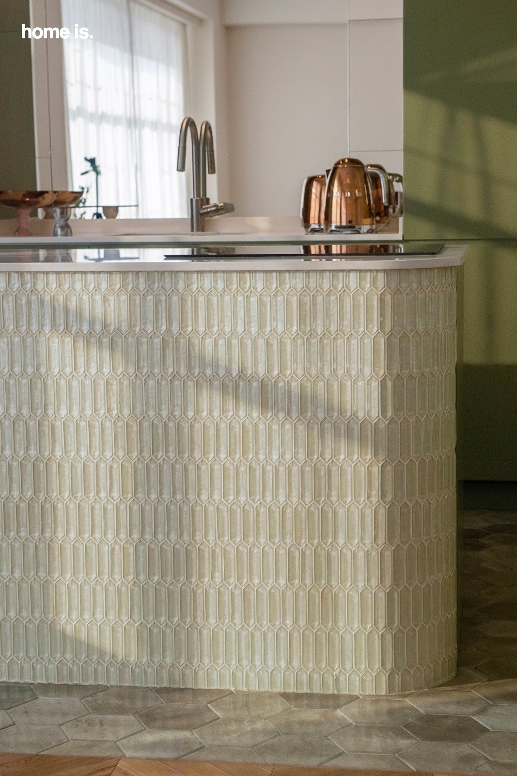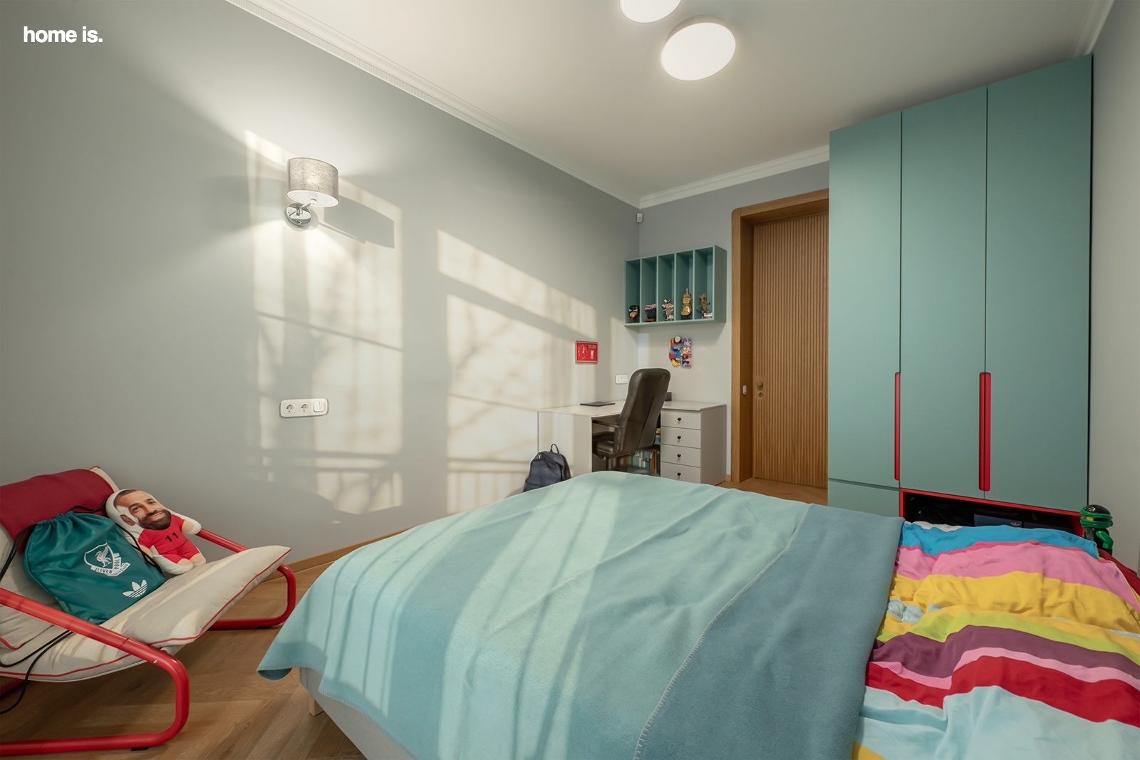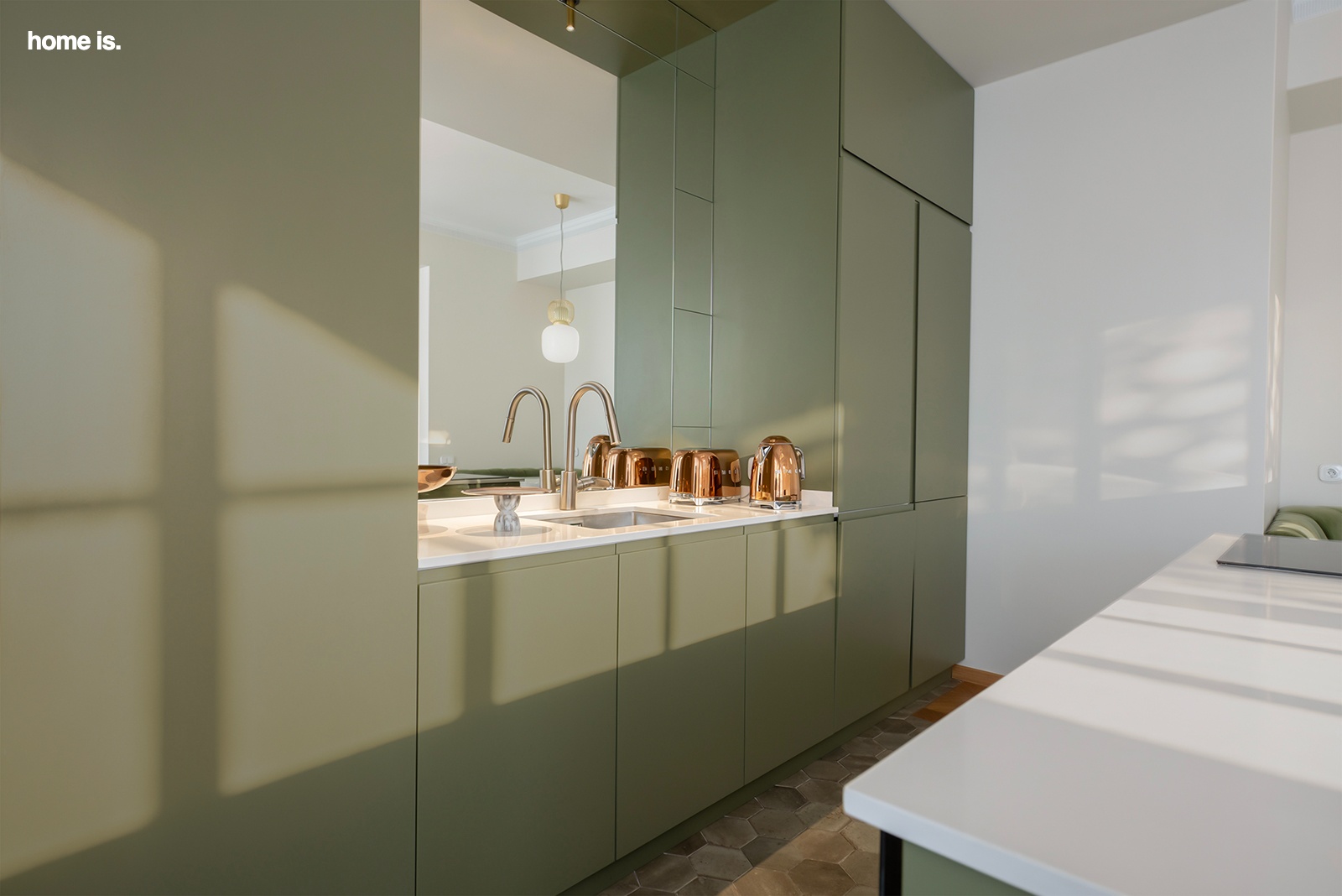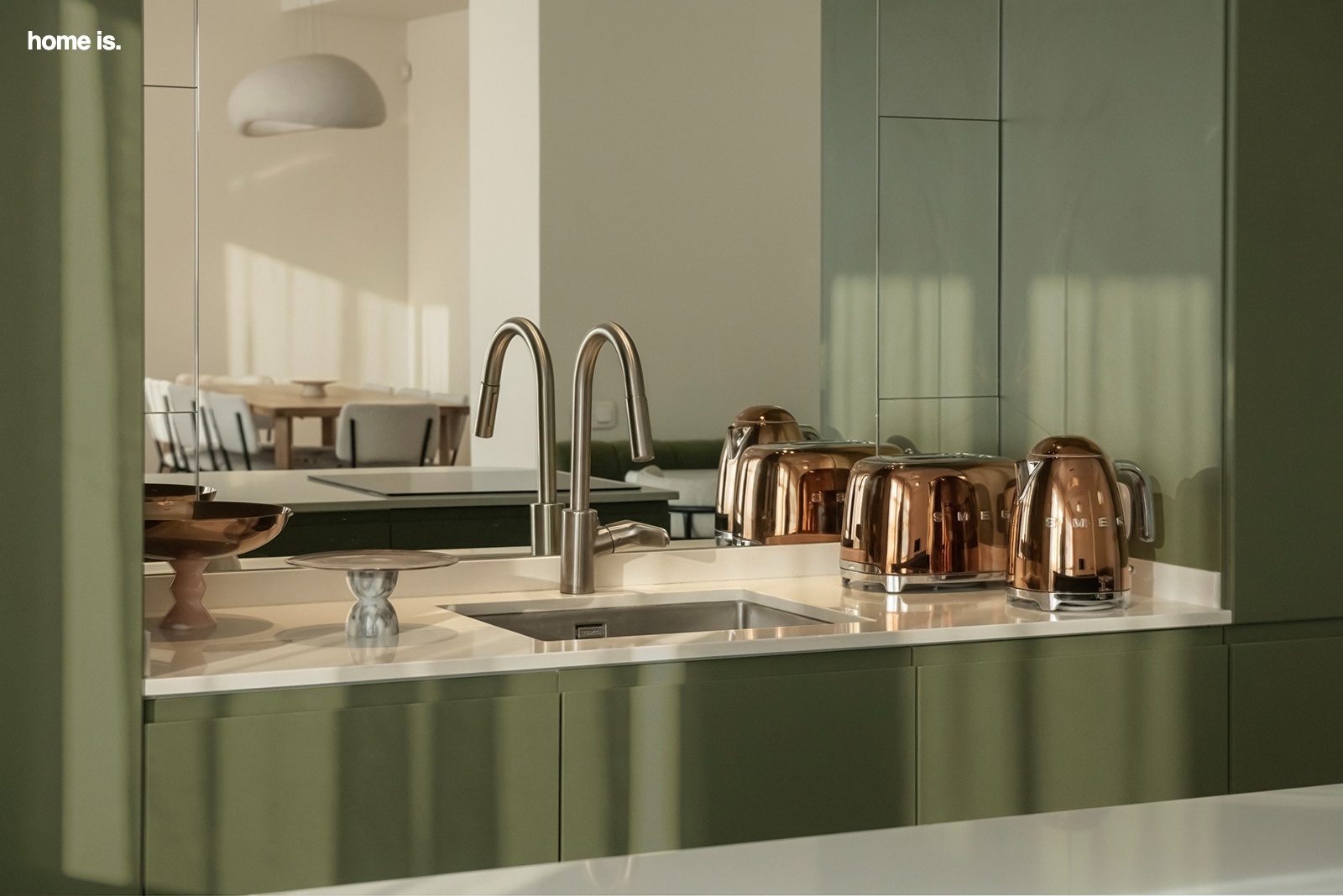 ინტერიერის ფერთა პალიტრა აგებულია ბუნებრივ ტონებზე — დომინირებს მწვანე და ღია ხის ფერი, რომლებიც სივრცეს სითბოსა და ბუნებრივ ხასიათს სძენს. ეს არჩევანი არა მხოლოდ ვიზუალურ კომფორტს უზრუნველყოფს, არამედ ბინას დროში გამძლე და უნივერსალურ იერს ანიჭებს. ბუნებრივი ფერები აქ არ არის მხოლოდ დეკორატიული ელემენტი — ისინი სივრცის მთავარ კონცეფციას ქმნის და ცხოვრების ყოველდღიურ რიტმს ორგანულად ერწყმის.