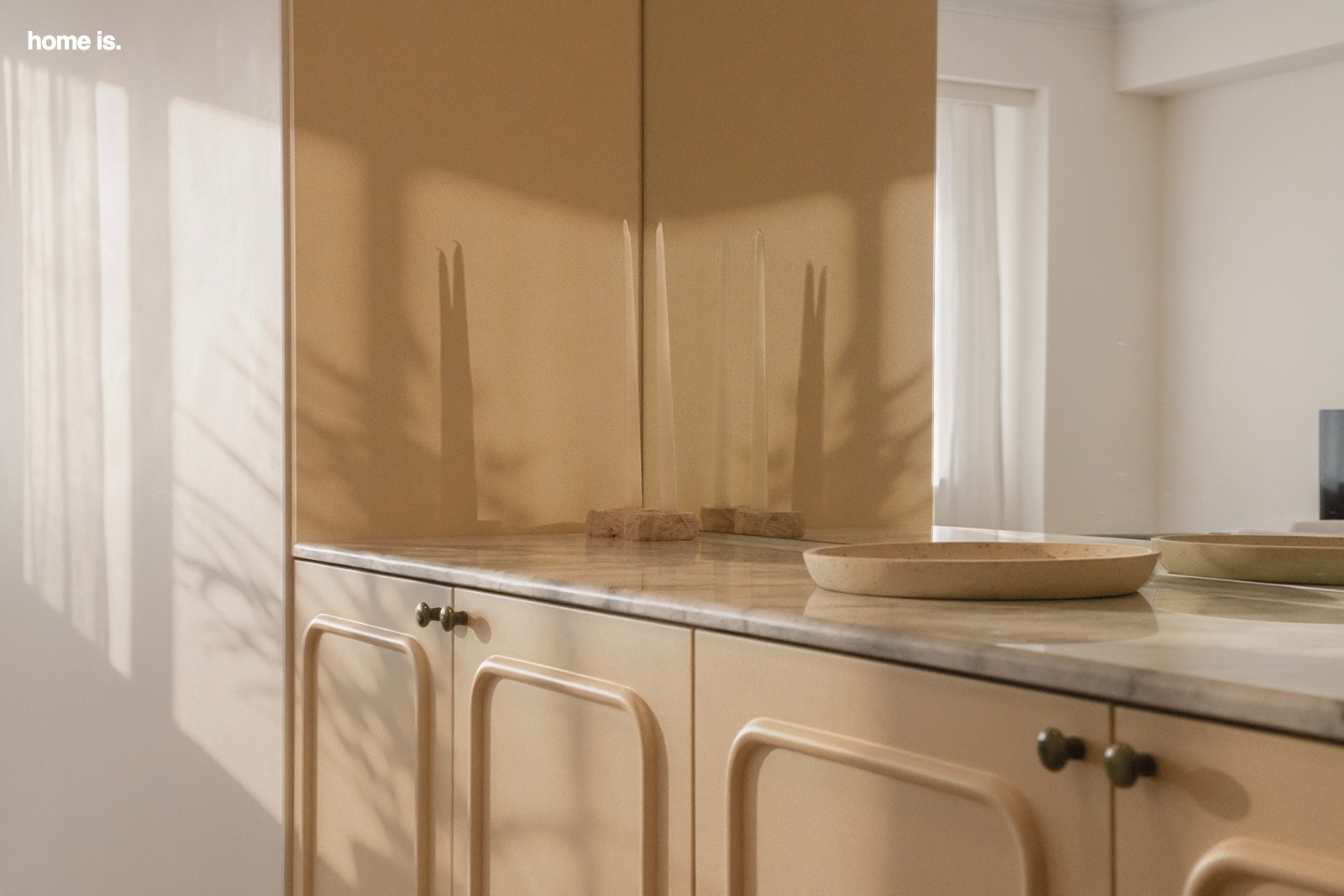 მინიმალისტური ბინა ბუნებრივი ტონებით – ბუკა დუმბაძის ინტერიერი მიცკევიჩის ქუჩაზე