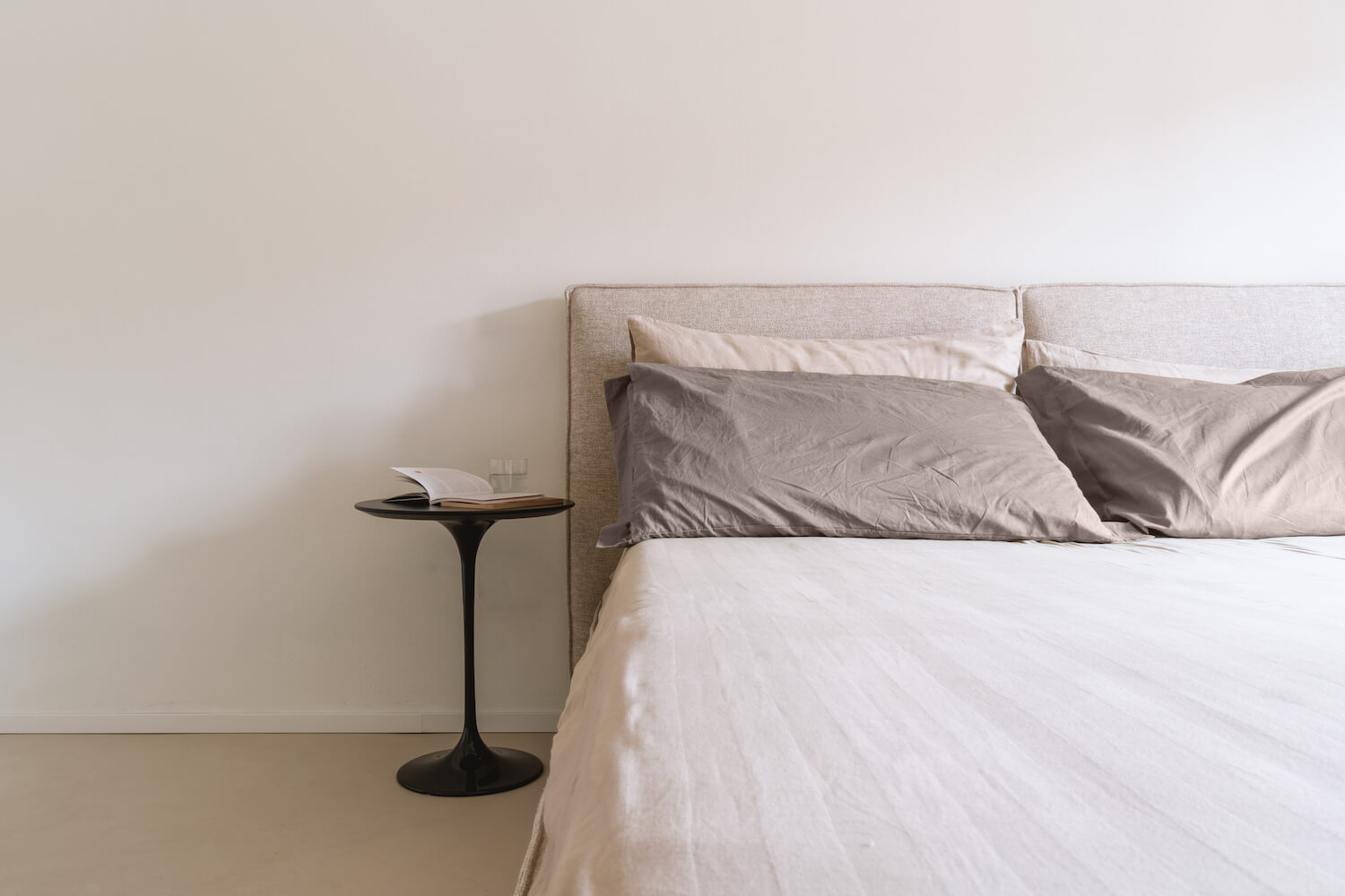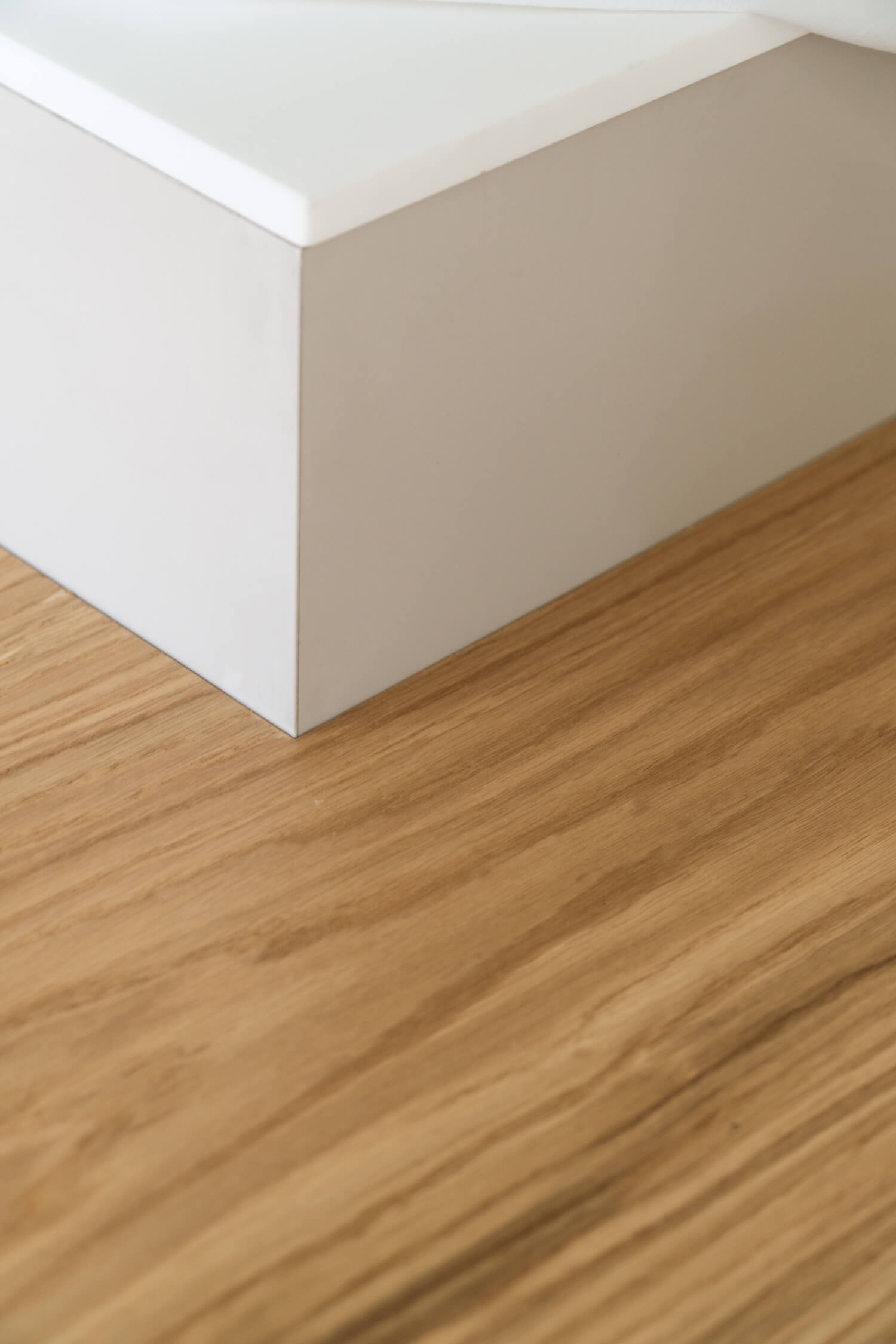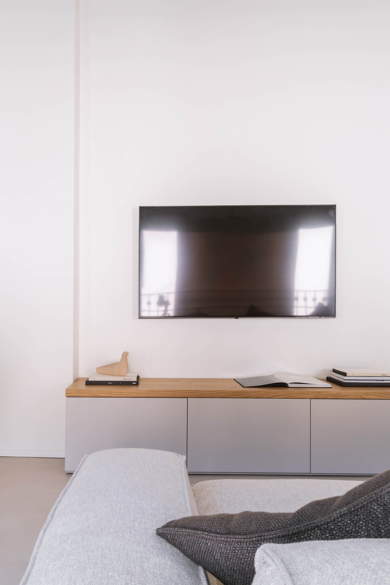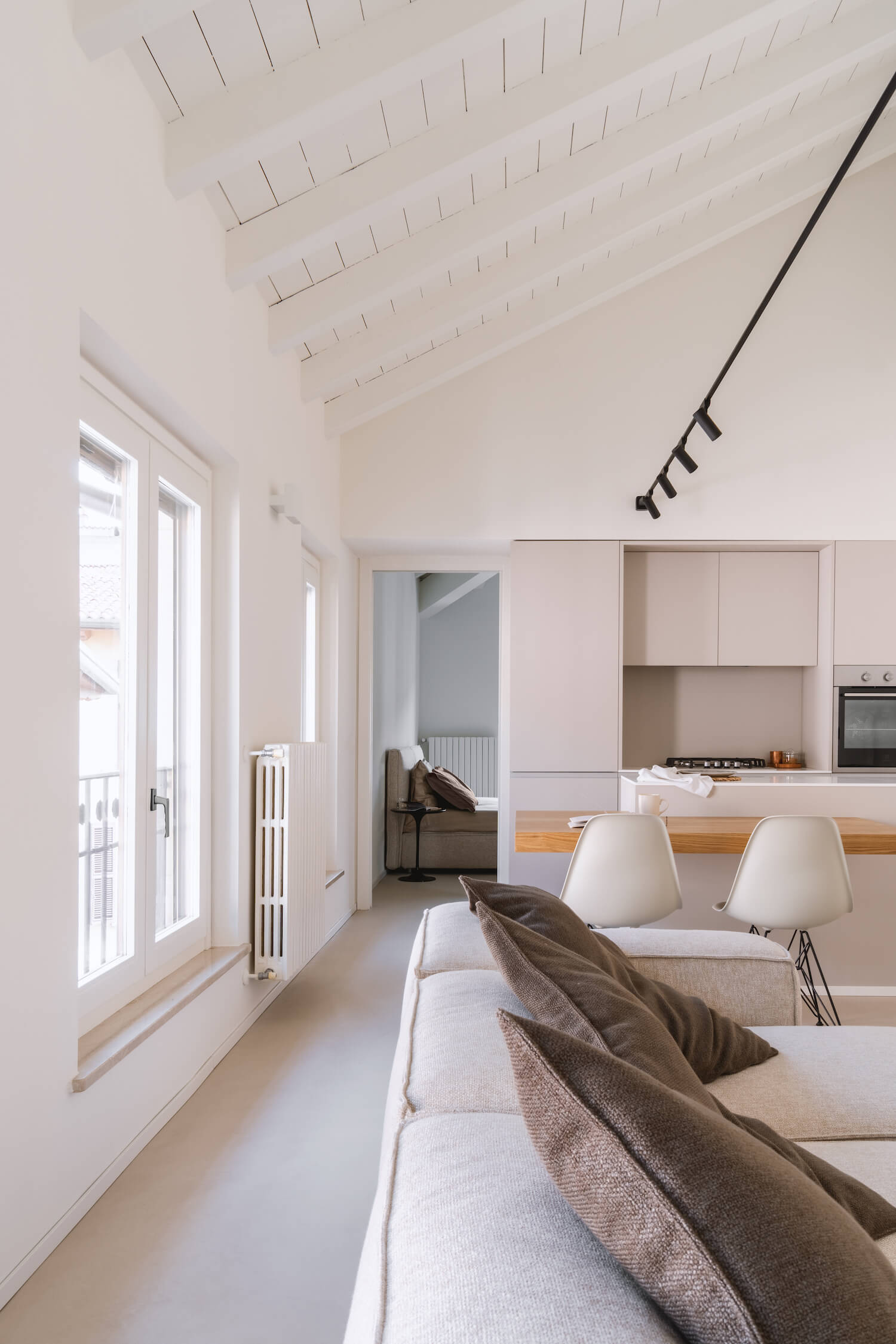 რბილი, მაგრამ გამორჩეული და დამახასიათებელი ინტერვენცია. ინტერიერის დაგეგმარების შეუცვლელად განახლებული სახლის დიზაინი მინიმალიზმისა და თანამედროვე გემოვნებისთვის დამახასიათებელი დეტალებისა და ფიზიონომიის შესაბამისად არის გადააზრებული. აქ ყველაფერი აუცილებელი და, იმავდროულად, დახვეწილია. არქიტექტურული ბეტონისგან დამზადებული იატაკი, ცვლილებების უწყვეტობის იდეის წარმოსაჩენად, არსებულ საფუძველზე განთავსდა. თაბაშირმუყაო და ხელახალი მოპირკეთება სპეციალურად გამოყენებულ იქნა სამზარეულოსთვის და საძინებლის გარდერობისთვის. ორივე მათგანი შეკვეთით დამზადდა.