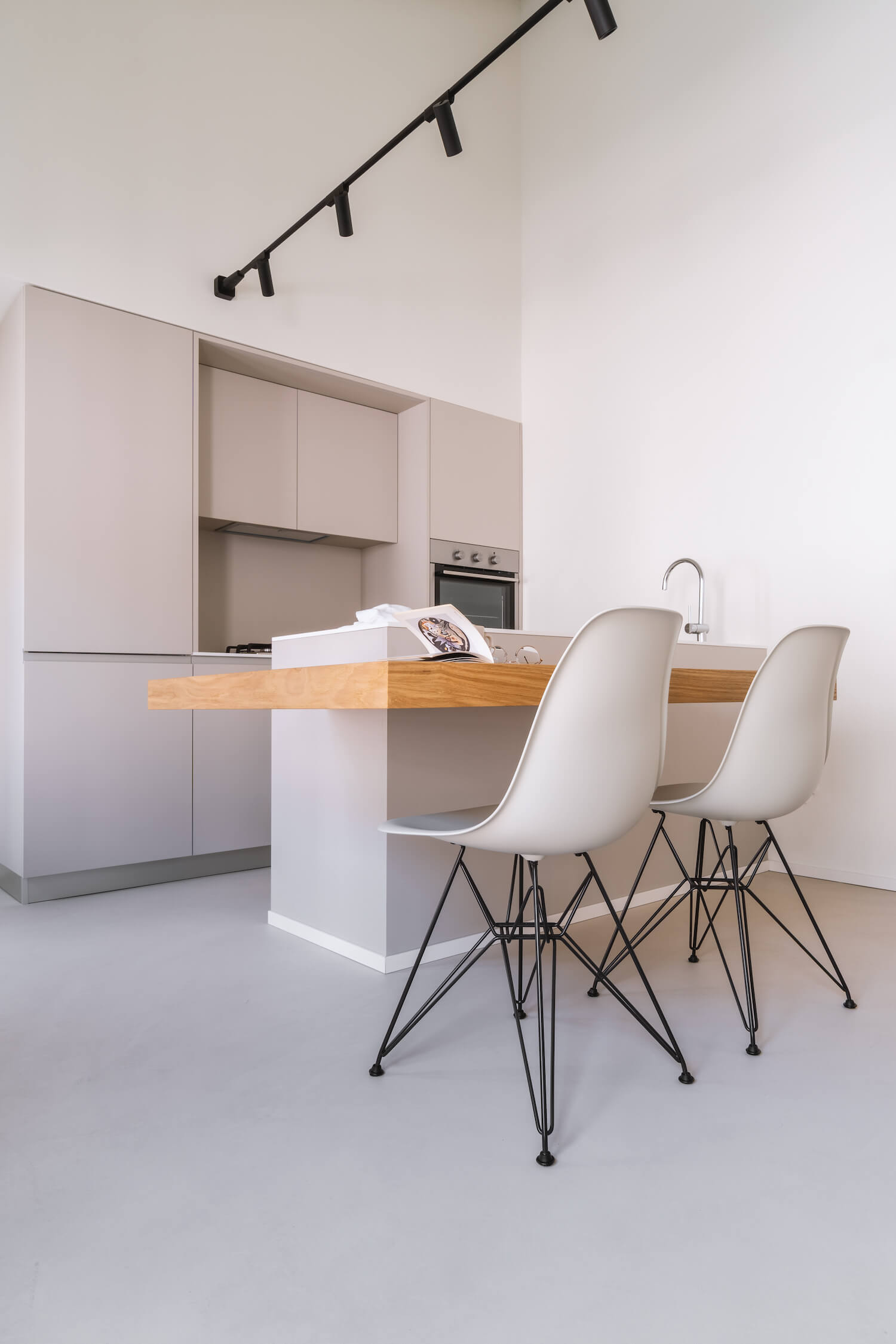ZDA-მ (Zupelli Design Architettura) იზრუნა როგორც კომერციულ ავეჯზე, საწოლით დაწყებული, სკამებით დამთავრებული, ასევე, LED განათებაზე, რომელიც სამზარეულოს გასანათებლად და ოთახისთვის შესაფერისი განწყობის შესაქმნელად გამოიყენება. ამ განსაკუთრებული ატმოსფეროს აძლიერებს ფერების არჩევანი – მსუბუქი და ნეიტრალური ტონები: თეთრი ყველა ფიქსირებული ნაწილისთვის, როგორიც არის მოწყობილობები, კარები, კედლები, ხის ჭერი. ქვიშისა და ხის ტონები კი როგორც იატაკისთვის, ასევე, ავეჯისთვის.
