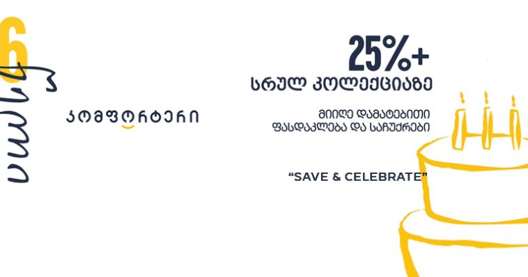 ქართულ ბაზარზე გამორჩეული ავეჯისა და აქსესუარების კომპანია — „კომფორტერი” 6 წლის იუბილეს აღნიშნავს. ამ მნიშვნელოვან თარიღთან დაკავშირებით, დაბადების დღის ფარგლებში, თავის ერთგულ მომხმარებელს 25%-იან ფასდაკლებას სთავაზობს სრულ კოლექციაზე და დამატებითი ფასდაკლების შესაძლებლობას აძლევს.