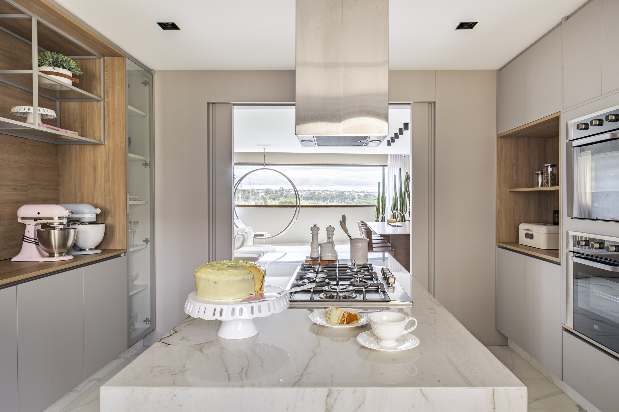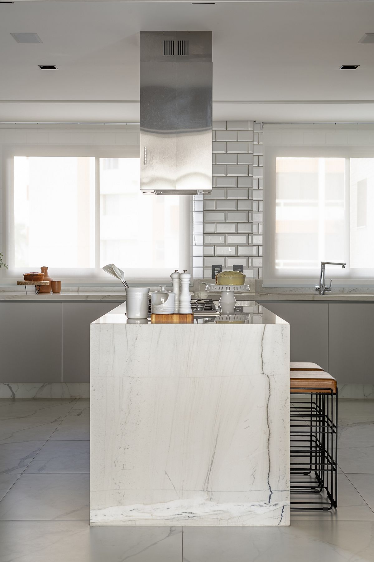 გასაკვირი არ არის, რომ კულინარიის ენთუზიასტი წყვილისთვის განკუთვნილი ბინის ცენტრში სწორედ სამზარეულოა მოქცეული. ბინის განახლებაზე ბრაზილიურმა კომპანია Studio 2 Arquitetura e Interiores–მა იმუშავა.