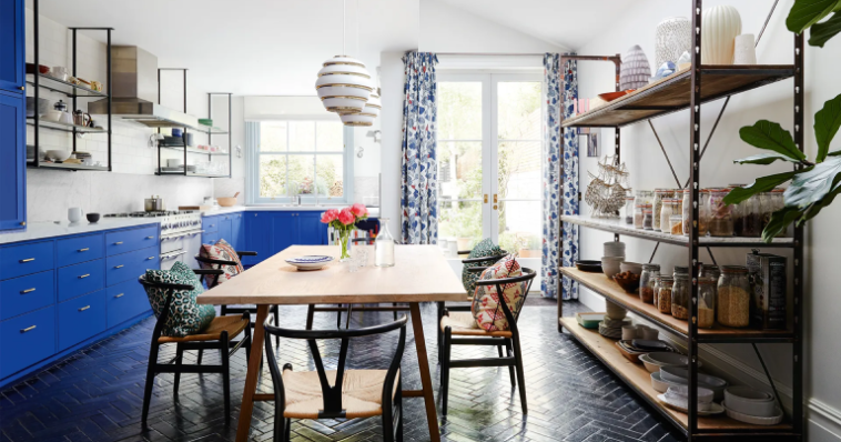სამზარეულოს სქემა დაიწყო “Wishbone” სკამებით. ამას დაემატა ლურჯი კობალტის ფასადის მქონე კარადები. იატაკი აქ შავი ბელგიური ქვისაა. „არ მინდოდა ხის გამოყენება. სამზარეულოში, ეს არც თუ ისე პრაქტიკულია“ – განმარტავს სუზი.