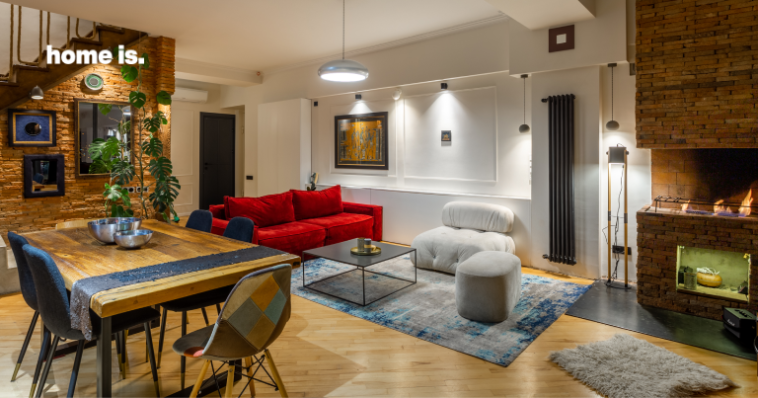 გაერთიანებულ მისაღებსა და სამზარეულო ოთახში საინტერესო დიზაინი გვხვდება. აღნიშნულ სივრცეში ერთდროულად ძველი, ნოსტალგიური ატმოსფერო და თანამედროვე სტილი იკვეთება. სასადილო ხის მაგიდა ოთახში ერთ-ერთ მნიშვნელოვან პრაქტიკულ და ამავდროულად, დეკორატიულ ელემენტს წარმოადგენს, რომელიც იდეალურად ეხამება ღია ხისფერ იატაკს, ბუხარსა და აგურის კედელს. მათი კომბინაციის შედეგად კი ბინა ძალიან მყუდრო, სიმშვიდის მომგვრელი და ინტიმური ხდება.