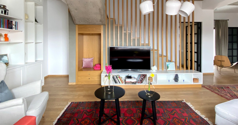 ყურადღებას იქცევს ბინის ზონირება, რომლის მიხედვითაც მაქსიმალურად არის ათვისებული სივრცე და მოწყობილია სხვადასხვა ფუნქციის კუთხეები – საკითხავი, სამუშაო, მოსასვენებელი. პირველი სართულიდან გამავალი ერთი ტერასა მოწყობილია ზაფხულის სეზონისთვის, მეორე კი გრილი საღამოების ცეცხლთან გასატარებლად, ან მეგობრებთან ერთად სავახშმოდ.