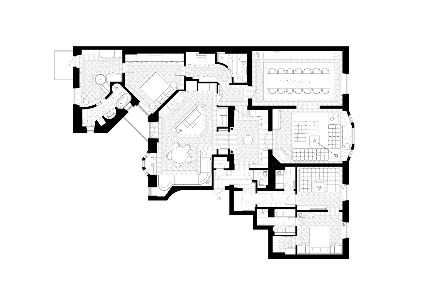 რემონტის ეტაპზე სამზარეულო უფრო ცენტრალურ ნაწილში გადავიდა, რამაც დამატებითი სივრცე შექმნა მისაღებ ოთახსა და სასადილო სივრცეს შორის. სტუმრებს შესაძლებლობა მიეცათ, რომ საცხოვრებელ და სასადილო ოთახებს შიდა დერეფნის მეშვეობით დაუკავშირდნენ. შედარებით უფრო კონფიდენციალური ოთახები, მაგალითად, საძინებელი და სააბაზანო განლაგებულია ბინის საპირისპირო ნაწილში. ფერების პალიტრა ამ შემთხვევაშიც ძალიან რბილი და თბილია, თუმცა საგრძნობლად განსხვავდება სხვა ოთახებში გამოყენებული ტონებისაგან.