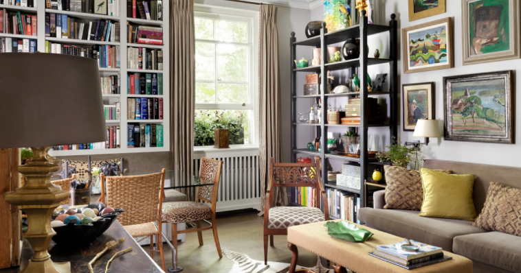 მისაღები ოთახი ალბათ ემას მიერ სივრცის ჭკვიანური აღქმის ყველაზე თვალსაჩინო დემონსტრაციაა. შთამბეჭდავი ავეჯით, ხელოვნების ნიმუშებით და წიგნებით სავსე ოთახი ჰარმონიულად და კომფორტულად გამოიყურება. L ფორმის დივანი კედლებს გარს ეკვრის, ხოლო წიგნების თარო პატარა მაგიდას და უამრავ სათავსოს აერთიანებს. კიდევ ერთი წიგნების თარო ფანჯრებს შორის არსებული სივრცისთვის დამზადდა, მის ქვემოთ კი დგას მინის სასადილო მაგიდა ემას მიერ დაპროექტებული სკამებით. უბრალო ფარდები და ღია ნაცრისფრად შეღებილი კედელი ემას კოლექციებისთვის ელეგანტურ ფონს ქმნის.