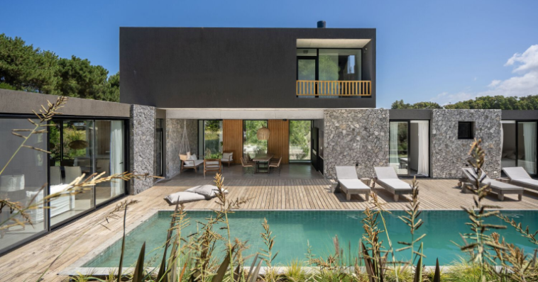 ქუჩიდან ხის ჭიშკარში შესვლისას აღმოჩნდებით ხის გემბანზე, რომელიც სახლის ინტერიერისკენ გაგიძღვებათ. მის გვერდით კი არის 16 მეტრის სიგრძის აუზი, რომლისთვისაც ბეტონი და ვულკანური ქვებია გამოყენებული.