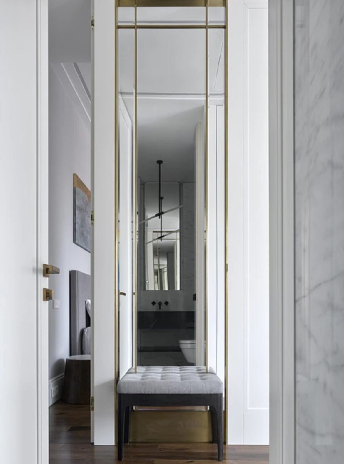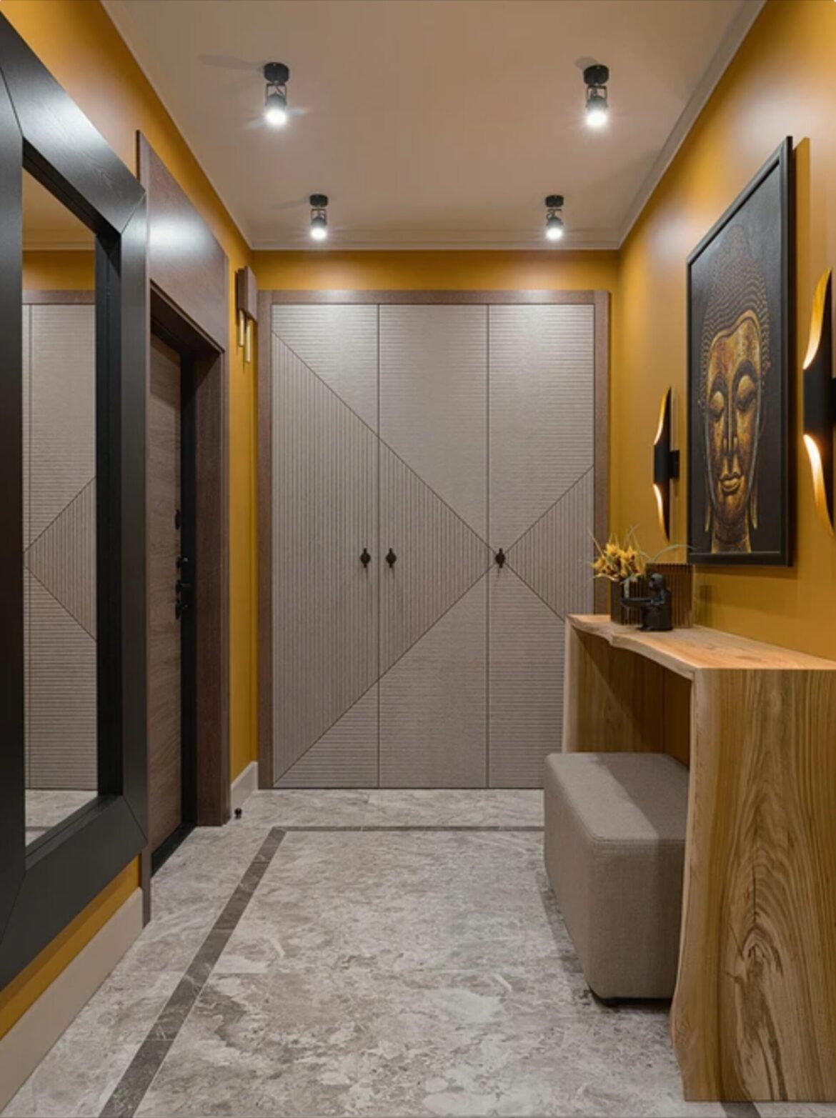 შემოსასვლელი, როგორც წესი, ბინის პატარა და გაუნათებელი სივრცეა. ხშირად ეს არის უფანჯრო ზონა. ამას ემატება სათავსოებისა და სარკის მოწყობის აუცილებლობა. ამიტომაც აქ მთავარი ამოცანა ბუნებრივი შუქის კომპენსირება, ფართის ვიზუალური გაზრდა და მოწესრიგებისთვის მოხერხებული გარემოს შექმნაა.