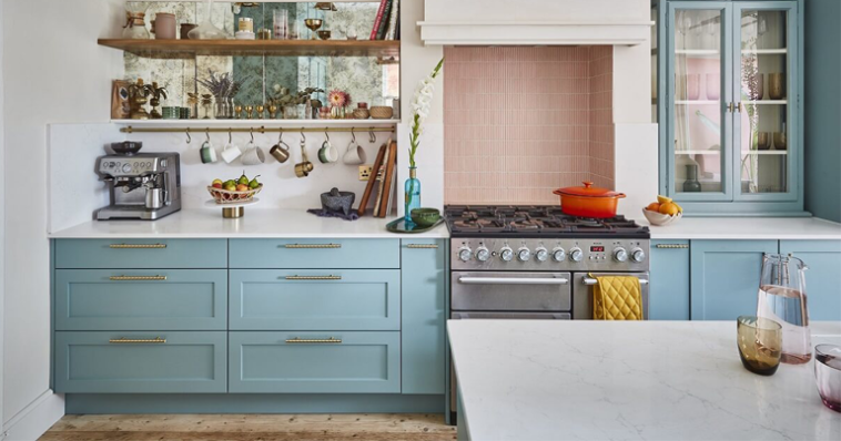 როგორც წესი, სამზარეულოებში, ძირითადად, ლურჯი ფერი გამოიყენება, თუმცა, ცისფერი შეიძლება უკეთესი არჩევანი იყოს, განსაკუთრებით მაშინ, როდესაც ის წითელთანაა შერწყმული. ფოტოზე სწორედ ასეთ ინტერიერს ხედავთ. მხიარული წითელი ზოლები და მუქი ჟოლოსფერი ფარდა შესანიშნავად ეხამება ცისფერ კარადებს.