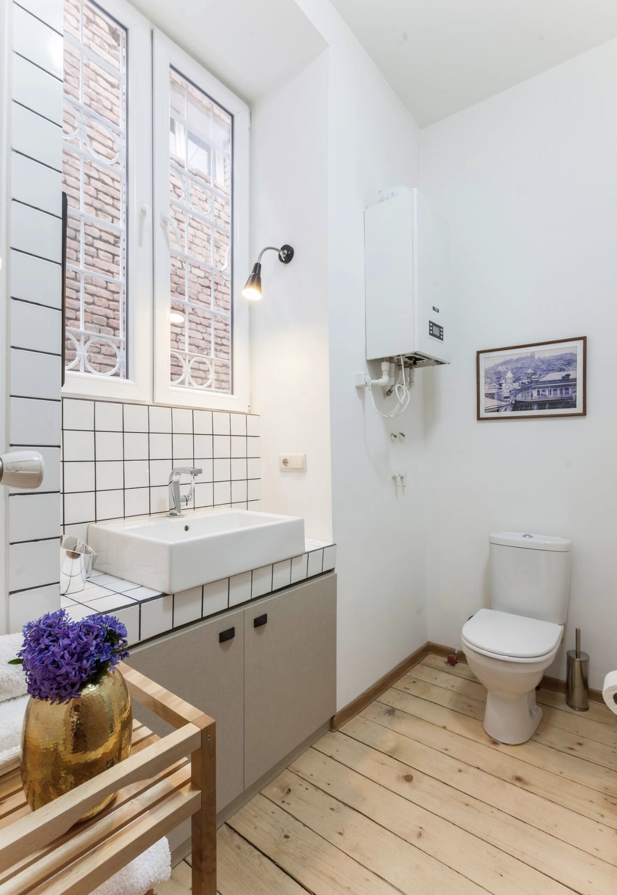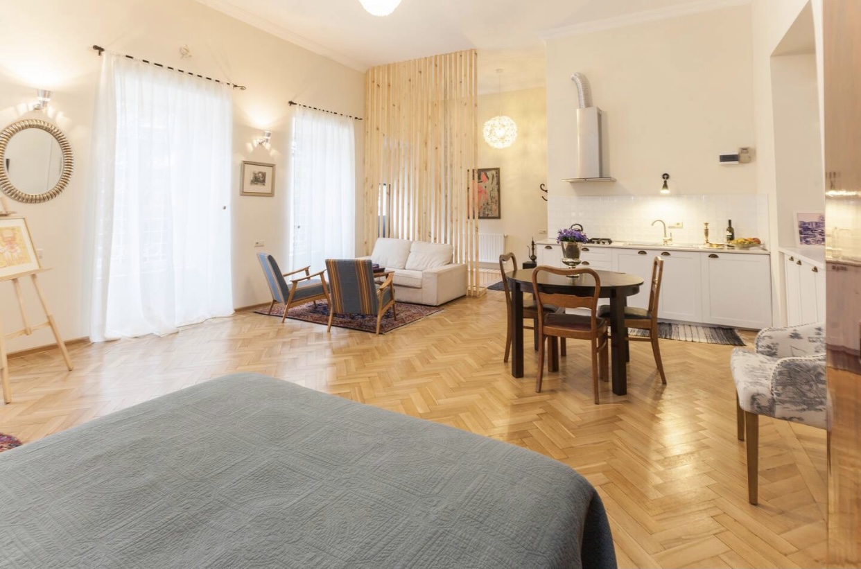 ბინა თავისუფლების მოედანთან ახლოს მდებარეობს თბილისის ძველ ქუჩაზე. სტუდიოში ოთახები არ არის გამოყოფილი და მას ღია გეგმარება აქვს.