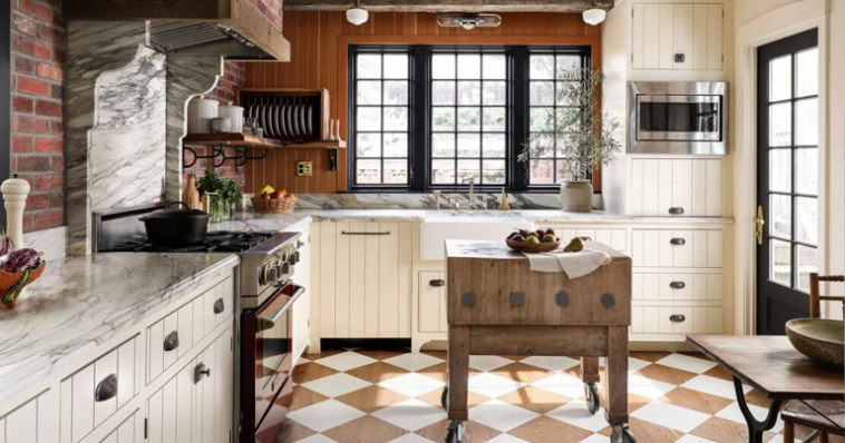 სახლის გამორჩეული სივრცე სამზარეულოა. სწორედ ამ ოთახში ჩანს ძალიან კარგად ინგლისური სოფლის სახლისთვის დამახასიათებელი დეტალები – ჭადრაკისებური იატაკი, აგურის კედელი და ძველებური ელემენტები. აღსანიშნავია, რომ პირვანდელი გეგმარების თანახმად, სამზარეულო სახლის ცენტრში მდებარეობდა, თუმცა დიზაინერმა ის შენობის უკანა ნაწილში გადაიტანა, რამაც შესაძლებელი გახადა ამ ზონიდან ეზოთი ტკბობა.