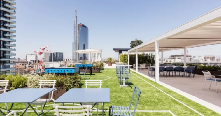 ღია და გაშლილი ტერასა ქალაქის ხედებს გადაჰყურებს და შეუძლია სტუმრების მიღება როგორც კერძო, ოფიციალური შეხვედრებისთვის, ასევე მუსიკალური სესიებისთვის და თანამშრომლებისთვის განსატვირთი ღონისძიებების მოწყობის მიზნით. იატაკის საფარზე ვხვდებით მწვანე მინდორს, რომელსაც საფეხბურთო მოედნის მსგავსი დიზაინი აქვს.