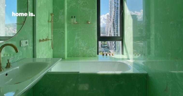 სახლის გამორჩეული ზონა სააბაზანოა, სადაც მწვანე ფერის ხელოვნური ონიქსია გამოყენებული, რომელსაც იდეალურად ეხამება ოქროსფერი ელემენტები. სივრცეში განსაკუთრებული ატმოსფერო იგრძნობა, რაც უპირველესად, დომინანტური მწვანე ფერის დამსახურებაა. ის ოთახში სიმშვიდესა და მყუდროებას ქმნის.