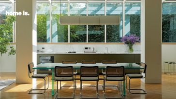 ამ ოთახშივეა მოწყობილი სასადილო კუთხეც, რომელსაც განსაკუთრებულ მომხიბვლელობას ცოცხალი გამწვანება ანიჭებს. შეიძლება ითქვას, რომ სივრცე ძალიან ორიგინალური, მაგრამ ამავდროულად საკმაოდ ზომიერია – მასში არ გვხვდება ზედმეტი დეტალები, აქსესუარები თუ დიზაიობიექტები, მაგრამ დახვეწილი ავეჯითა და ფერებზე ხაზგასმით, ინტერიერს მრავალფეროვანი და ინდივიდუალური ხასიათი ეძლევა.