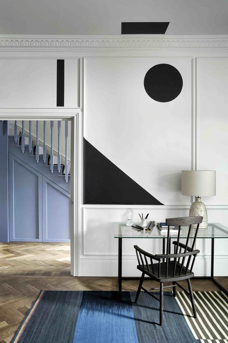 სივრცეში პროპორციული გეომეტრიული ფორმების გამოყენებამ, შესაძლოა, თქვენი ოთახი თანამედროვე ხელოვნების გალერეად გადააქციოს. ჯერ კონტურები ფანქრით დახაზეთ, შემდეგ კი აუცილებლად გამოიყენეთ სამღებრო წებოვანი ლენტი, რათა ნახატი მოწესრიგებული გამოვიდეს.