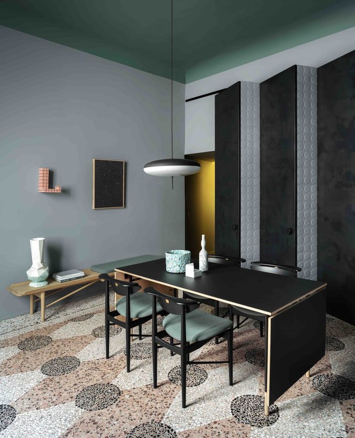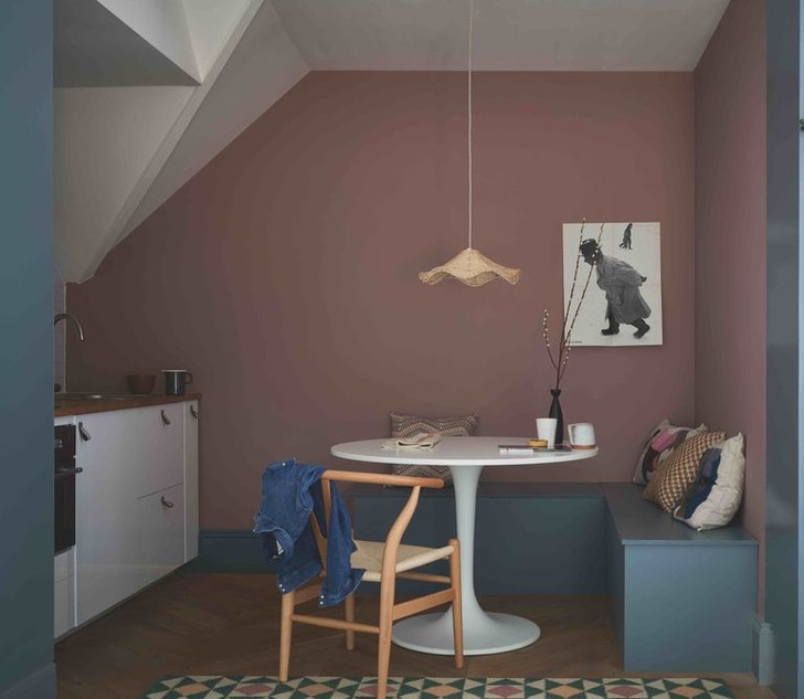 სახლის ყველაზე ნაკლებად ფუნქციონალური ადგილიც კი, შეიძლება, საღებავის დახმარებით გარდაიქმნას. მაგალითად, ფოტოზე ნაჩვენები კიბისქვეშა პატარა სივრცე სასადილო ოთახად იქცა. ჩაშენებული სკამები, რომლებიც სათავსოს ფუნქციასაც ასრულებს, კედლებთან კონტრასტშია, ხოლო ჭერი თეთრია, რათა სივრცე ვიზუალურად გაზარდოს.
