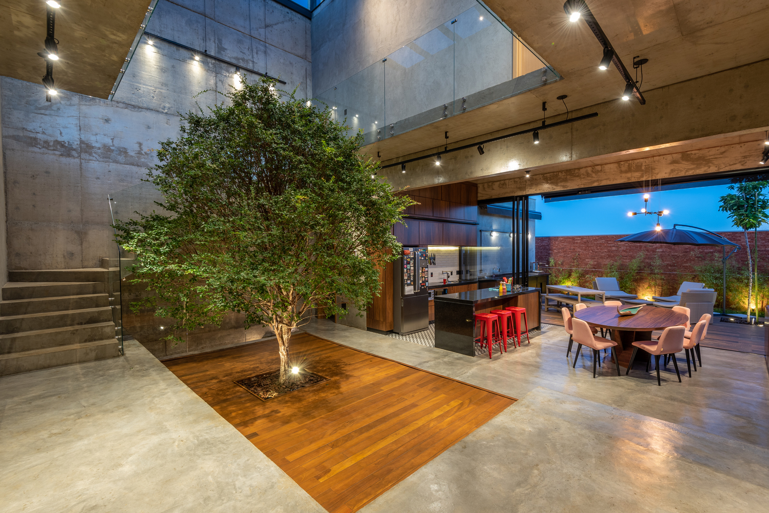 ბეტონის კუბის ფორმის საკმაოდ მასშტაბური სახლი არარაკარაში, ბრაზილიაში 2017 წელს დამთავრდა, ინტერიერში ჭარბობს ხის მასალა და გამწვანება, ცენტრში კი დარგეს ხე (Jabuticaba tree), რომელიც ძალიან მოუხდა ინტერიერს.