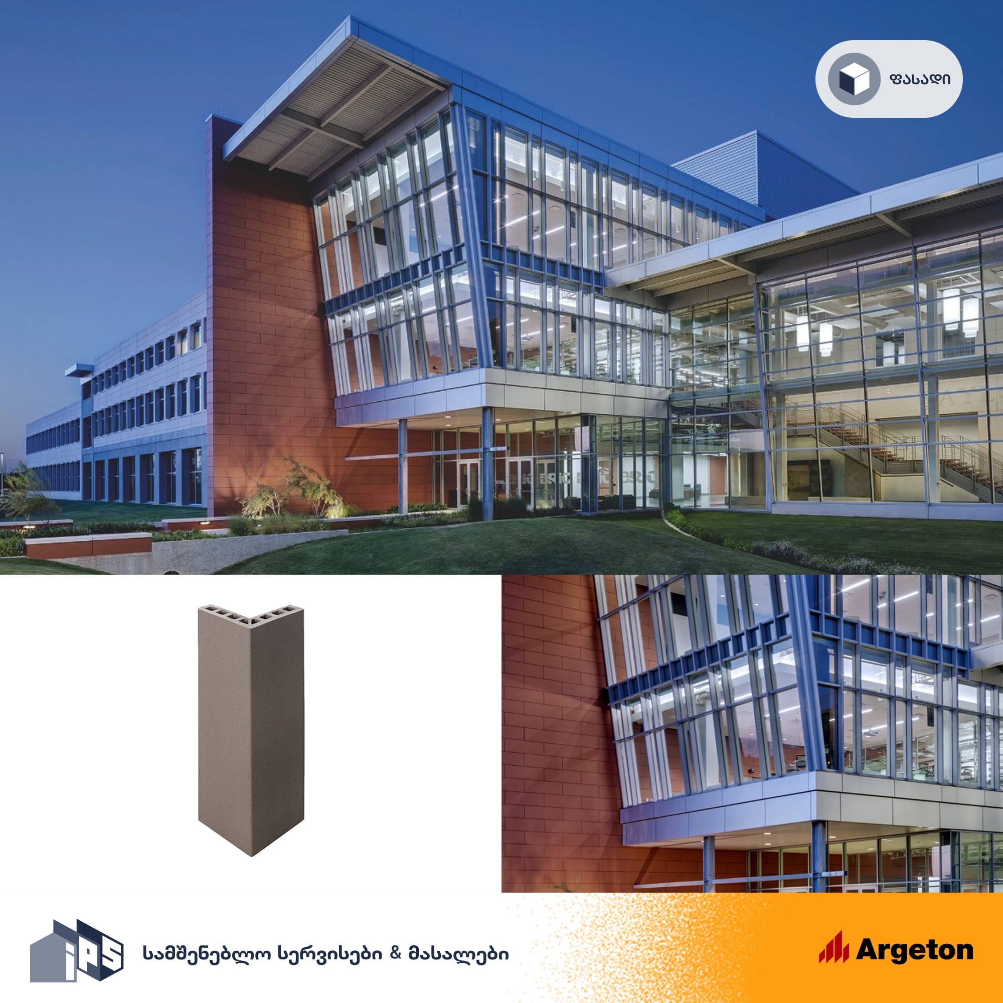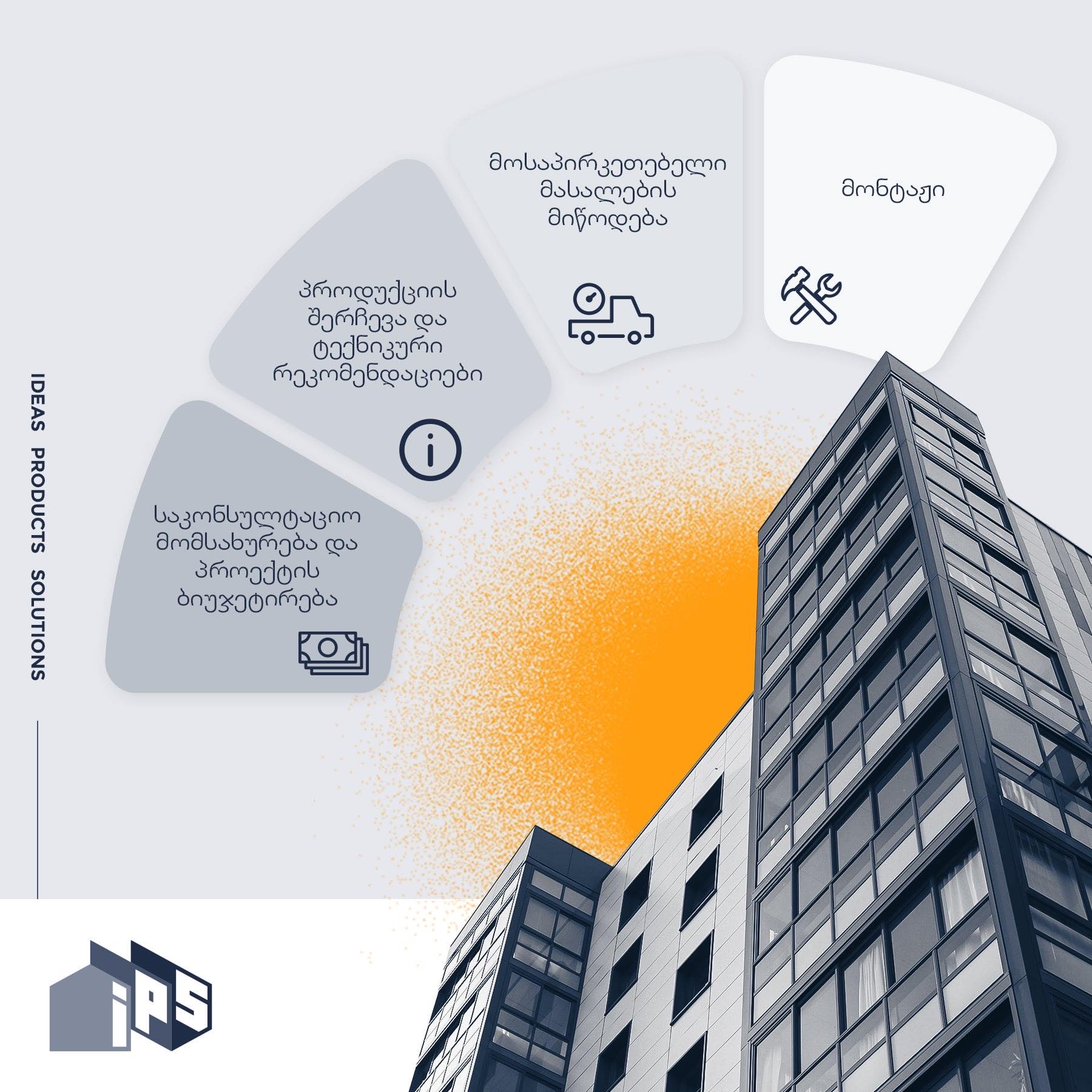 IPS ფასადი — ფასადის პროექტირება, საფასადო მასალების შერჩევა, მიწოდება და მონტაჟი;