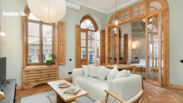 ამ მისაღებში ხისფერი დომინირებს, რომელსაც ჰარმონიულად ეხამება თეთრი ფერის ავეჯი და აქსესუარები. ოთახში სიმყუდროვე და ბუნებასთან სიახლოვე იგრძნობა, რასაც კიდევ უფრო მცენარეები განამტკიცებენ.