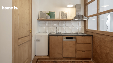 სამზარეულოს ინტერიერში ბუნებრივი მასალები ჭარბობს. იატაკი, ავეჯი ხისგან არის დამზადებული. ხე გვხვდება აქსესუარებშიც. ხისფერთან ჰარმონიულად არის შეხამებული შავი დეტალები. ოთახს განსაკუთრებით ამშვენებს დარაბები, მცენარე და თეთრ და შავ ფერში გაწყობილი ავეჯი.