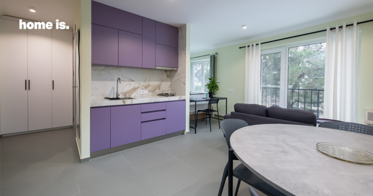 ბინაში შესვლისთანავე განსაკუთრებულ ყურადღებას იისფერი სამზარეულო იქცევს, რომელიც სივრცეს აცოცხლებს და ახალისებს. აღნიშნულ ელემენტს ინტერიერში სითამამე შემოაქვს და მშვიდ, სადა ფერთა პალიტრას ამდიდრებს.