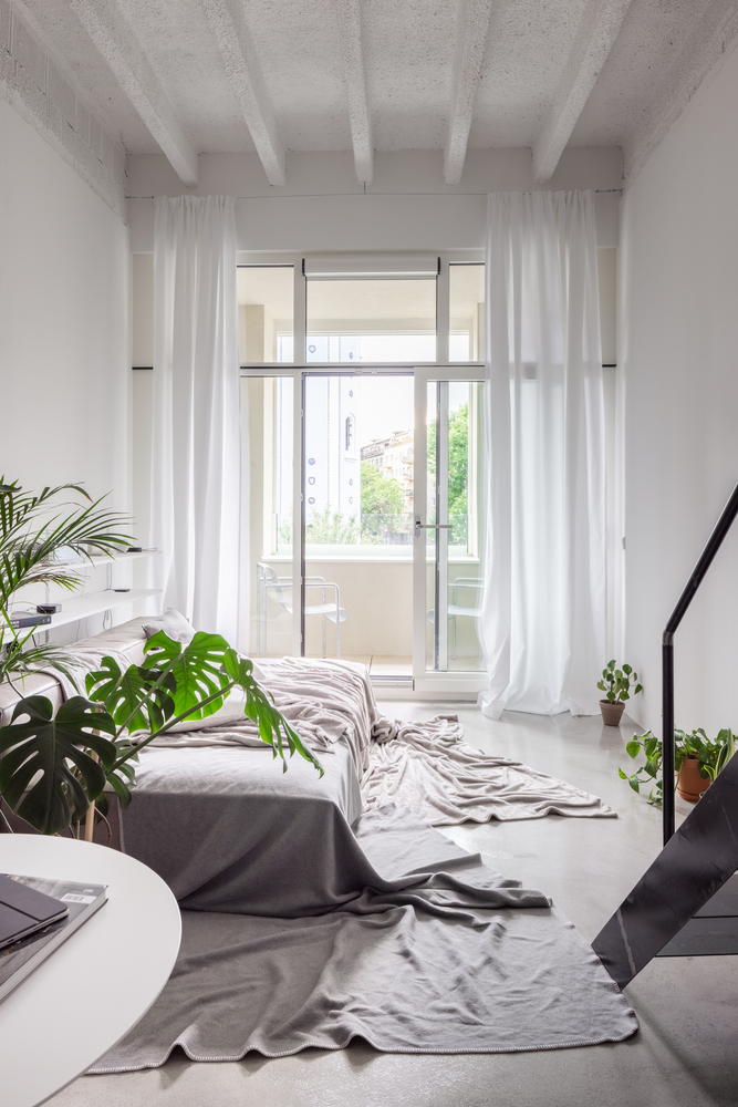 ზემოთ თქმულიდან გამომდინარე, მასალები ძირითადად გამჭვირვალე და ფუნქციონალურია. ღია სივრცე მაღალი ჭერით გამოირჩევა. თავდაპირველი სტანდარტული განლაგება გვთავაზობს ცალკე აბაზანას, დადაბლებული თაბაშირის მუყაოს ჭერით, ყველა შესაძლო ფარული გაყვანილობითა და ტექნოლოგიით. სამზარეულო კი ეკლესიის არაჩვეულებრივი ხედისკენ ზურგით იყო მიმართული. ჭერის მოხსნის, ტექნოლოგიური ინფრასტრუქტურის რეორგანიზაციისა და ანტრესოლის დამატების საშუალებით, სტუდია გახდა სრულფასოვანი ბინა განცალკევებული ღამის ზონითა და კომფორტული კიბეებით.