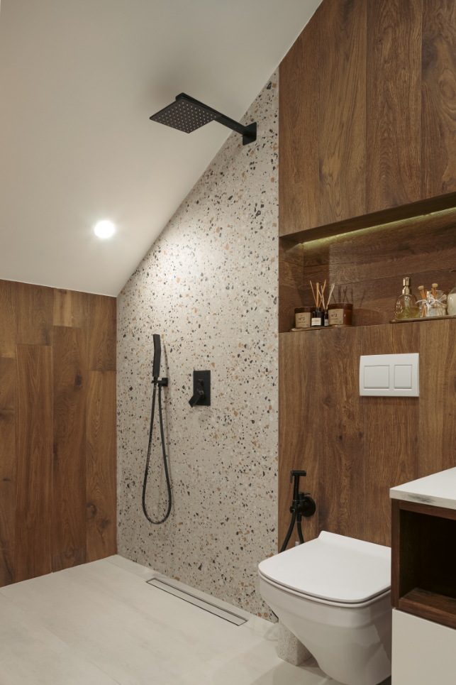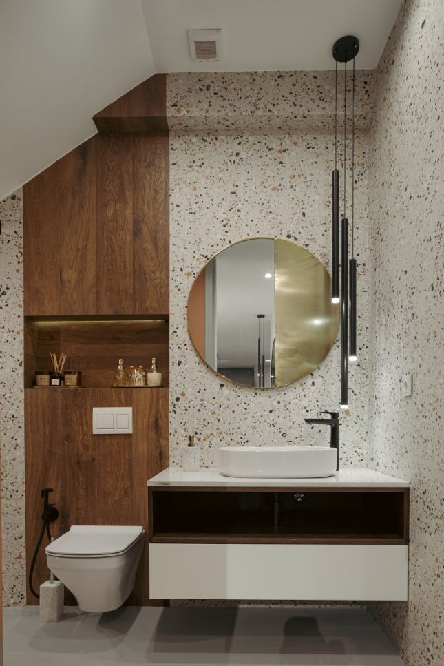 ტექსტურების მრავალფეროვნება და მასალათა კონტრასტები — ხის სითბო, ბეტონის სიგლუვე, კლდის სიღრმე, რბილი ავეჯის ფაქტურა — ქმნის გარემოს, რომელიც ერთი მხრივ, ძალიან პოეტურია და მეორე მხრივ – სრულად მორგებული თანამედროვე ოჯახის საჭიროებებზე.