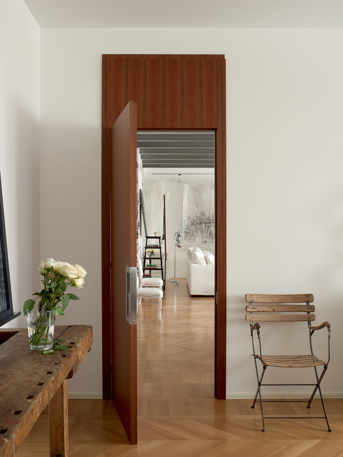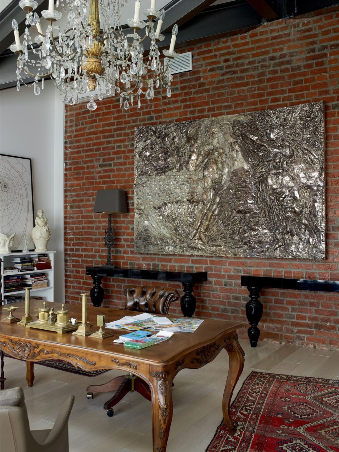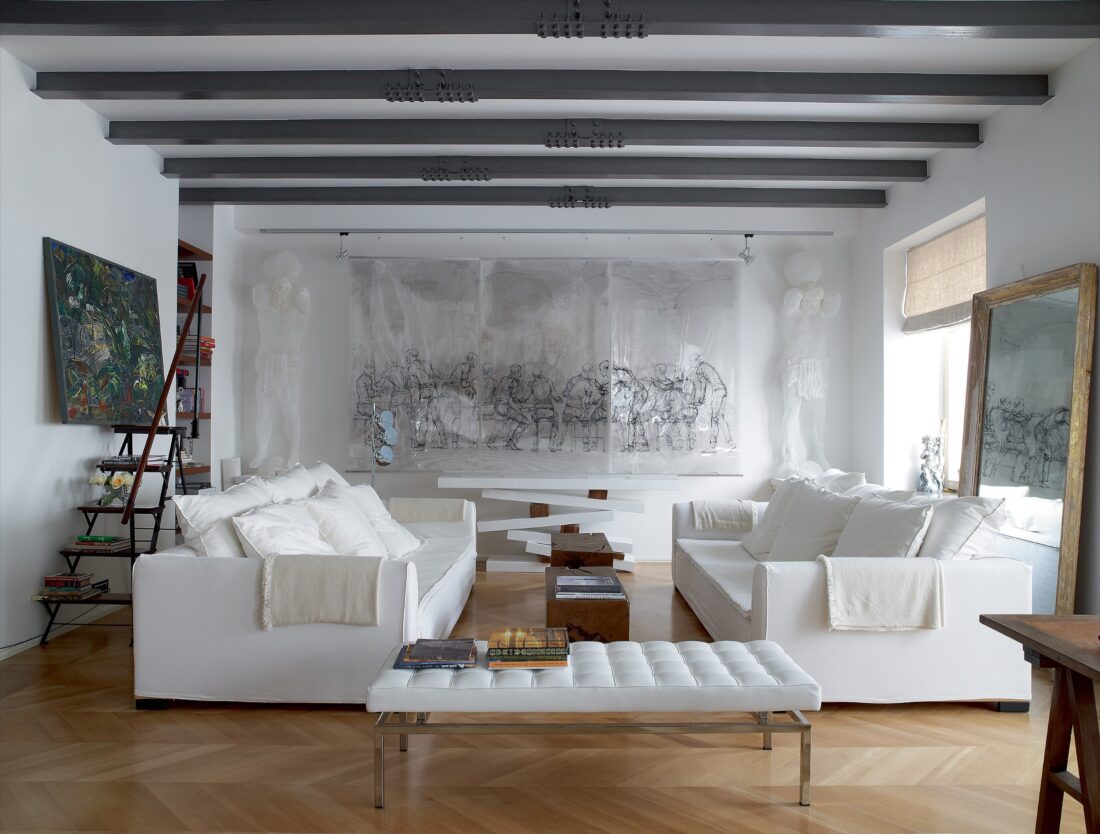 კედლებისა და იატაკის ნეიტრალური ფერი, რომელიც აგურის კედლებისა და სხვენის გარდა მთელს სახლში ერთნაირია, ბინას ვიზუალურად კიდევ უფრო ზრდის და სურათებისთვის დასაკიდ დამატებით სივრცეს ქმნის. მონოქრომული სივრცე მათი სისტემატური გადაადგილების აუცილებლობას ხსნის. მოხერხებულობისთვის ბევრი ნამუშევარი სპეციალურად დაპროექტებულ კონსოლებზე განათავსეს, რომლებიც ოთახების მთელ პერიმეტრზეა გაშლილი. ბინა იმგვარადაა მოწყობილი, რომ მთელი ინტერიერის შეცვლა აქ მყისიერადაა შესაძლებელი.